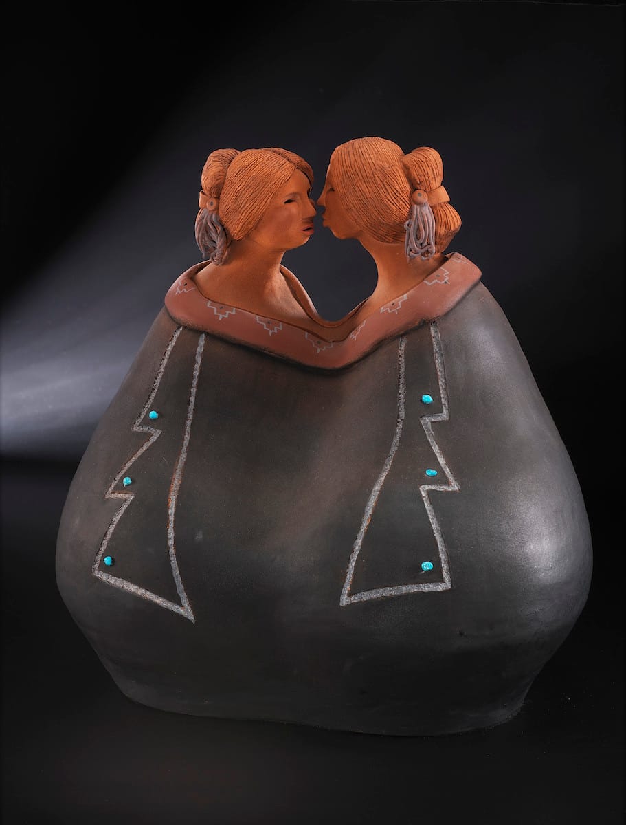 This unity is echoed in Pablita’s “Navajo Sisters — A Secret” (c. 1990–91), in which two women are bound together within a single, pear-shaped vessel that doubles as a black robe or blanket. The bulbous shape suggests comfort and intimacy as the sisters face each other, whispering, communing.