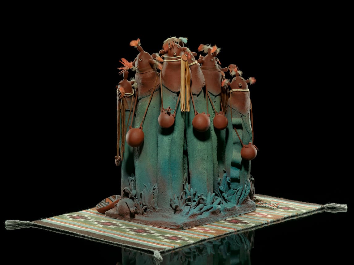 Narciso’s daughters, Pablita and Elizabeth, inherited their father’s gift for portraying dynamic movement in their multimedia ceramic sculptures. Elizabeth’s Mudhead Kachinas (Navajo clowns or tricksters) convey the humor and joy that permeate Navajo life. Figures sit, kneel, and dance, the tension in their bodies evident through their traditional clothing, detailed down to the leather moccasin or fringed corn husk. In her “Rain Watch — Cloud Gathering” (1995), a group of Mudheads huddle together, carrying tiny canteens, miniature decorated pots at their feet. The slight variations in their stances and in the decorations of their feathered masks impart individuality to each of them — a sense of uniqueness even as they stand unified as a group.