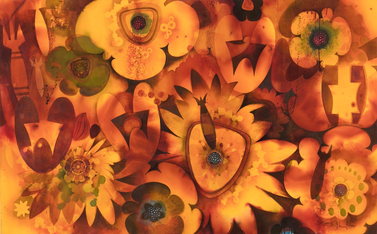 Tony Abeyta’s paintings complicate the legacy handed down to him by his father and sisters. As a biracial artist, Tony embraces Navajo and Anglo visual languages, and his paintings allude to American abstract traditions, Native iconography, and some of the abuses the American government has enacted on Navajo land and people. Across several large-scale paintings (Abeyta also features Tony’s sculpture, metalwork, and jewelry), motifs such as moloch blossoms, seed pods, abstracted double-lobed shapes that echo the silhouette of Pablita’s "Navajo Sisters," faces whose mouths form the “o” of mid-song, torpedoes, and spherical bombs (possibly references to the US government’s history of laying waste to Navajo land in pursuit of its nuclear weapons agenda) layer over one another, no one shape privileged. There is harmony in the chaos, hózhó made manifest, a striving for balance in the face of a looming threat.