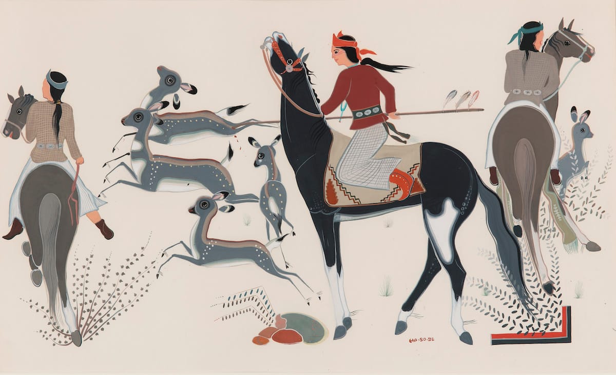 After the war, when he had recovered from shell shock enough to begin studying art again, he enrolled at the University of New Mexico, where he studied with Transcendentalist painter Raymond Jonson. Among the subject matter he explored during this period were depictions of Navajo myth. His paintings of skinwalkers, witches who take on animal forms, were the first visual representations of this subject, which is still taboo in Navajo culture. In one untitled drawing on view in Abeyta, a werewolf claws at a Navajo woman, pulling her from her horse. The shallow space of the flattened picture plane forces all the action to the fore and underscores the inescapable violence of the scene, all without one drop of blood.
