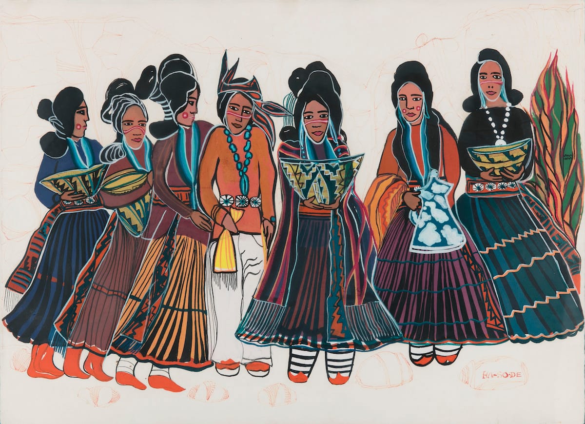 Andrea Hanley (Navajo), chief curator at the Wheelwright Museum of the American Indian, knew Pablita when both were living in Washington, DC, and working in various legislative posts. Pablita took the young Hanley under her wing, offered friendship, and helped her navigate the ins and outs of national politics. Hanley sees Abeyta | To’Hajiilee K’é as a love letter to the entire Abeyta family, and to Pablita especially, whose unrelenting efforts on behalf of Native rights led to the establishment of the National Museum of the American Indian at the Smithsonian, an institution that thrives today as a wellspring and center of Indigenous art and culture — a revolutionary step away from the classification of Native art as an ethnographic subject.