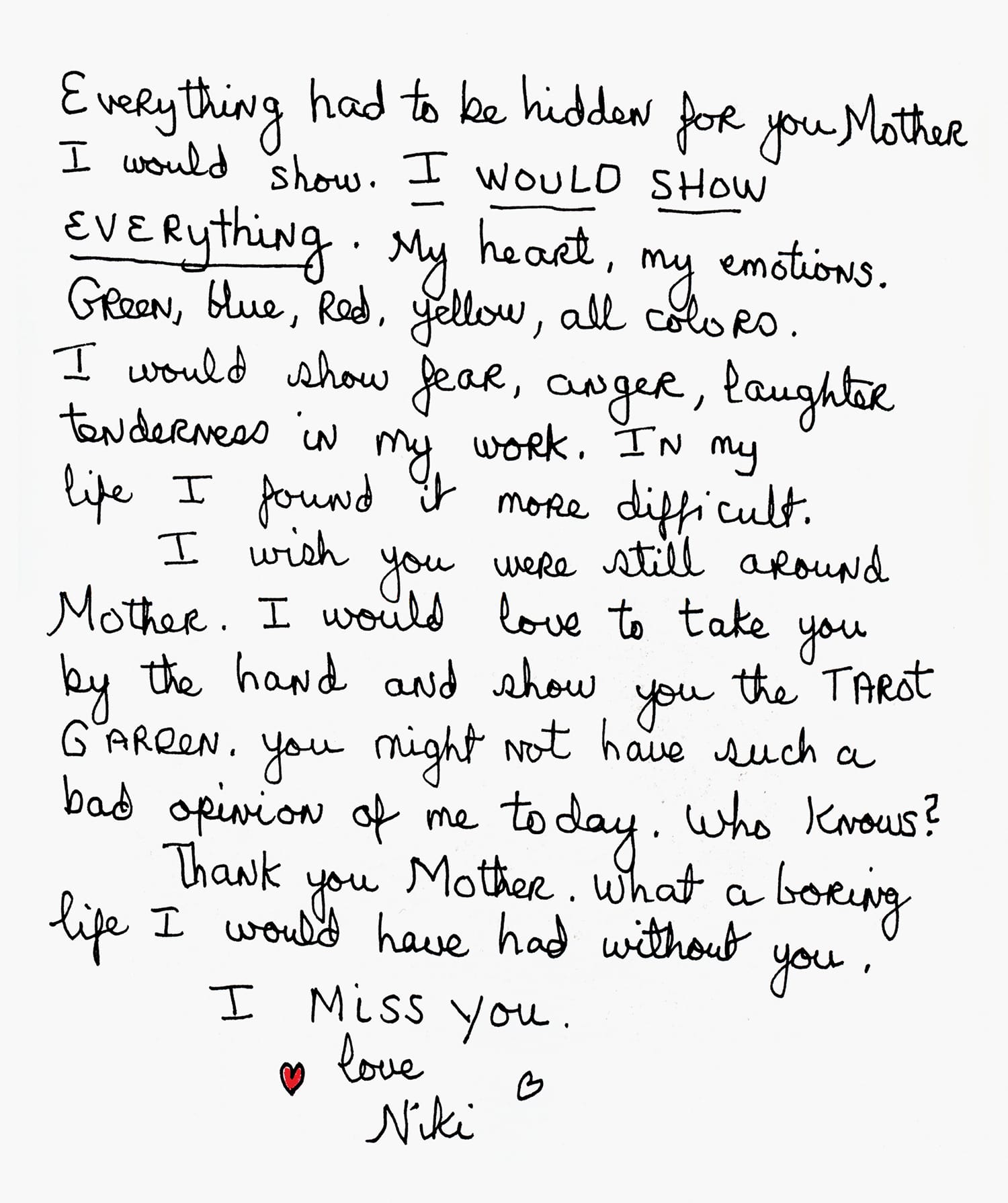 The person who emerges is open, driven, and often remarkably perceptive about who she is and why. "One of the reasons very little has been written on my work is that I am difficult to categorize," the artist writes in a draft of her text "Niki by Niki." It's lucky, then, that she has left so much writing herself.