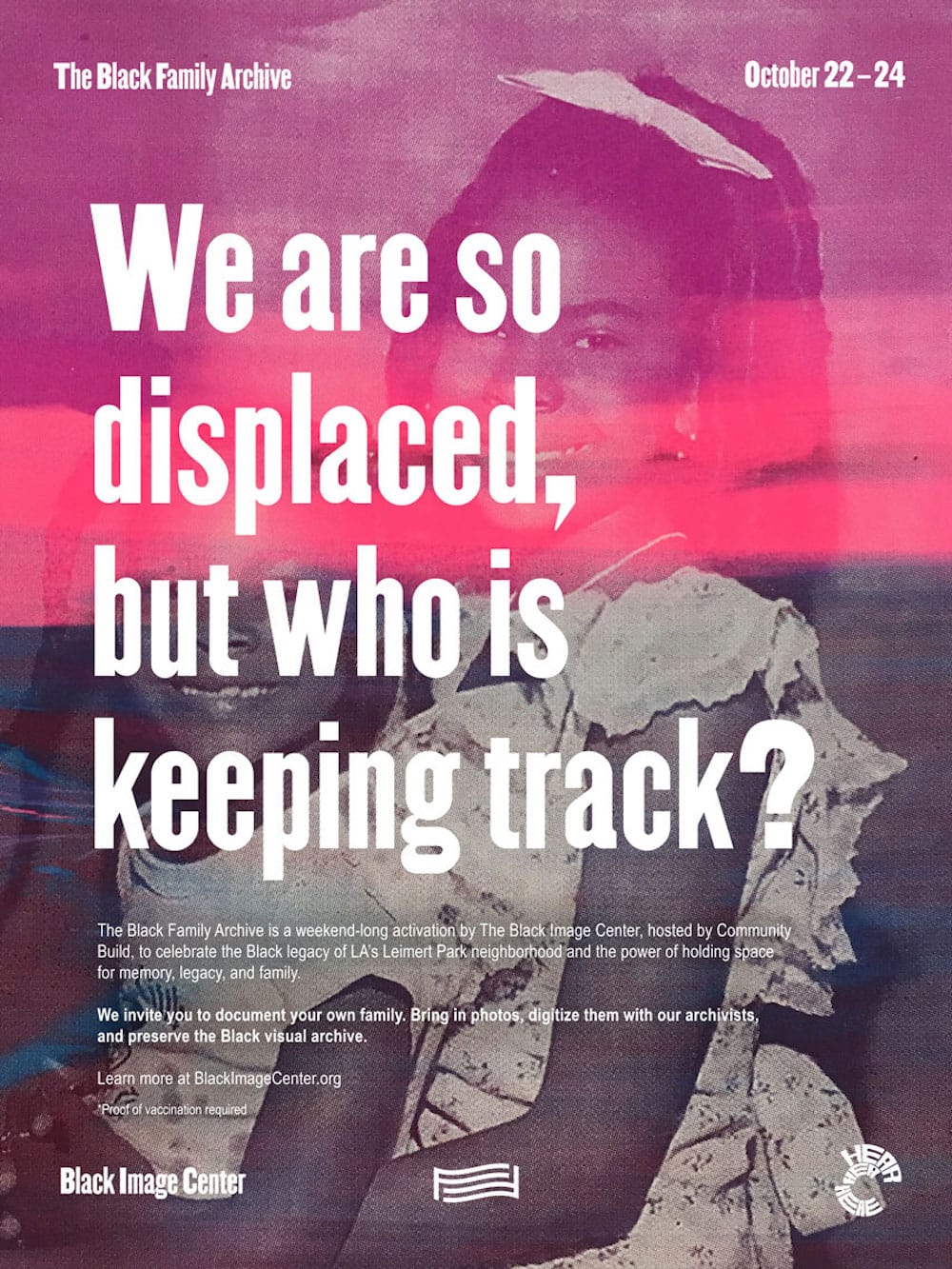 The collaborative nature of The Black Image Center was an important aspect of their work from the beginning. The collective’s first major project was a collaboration with artist Hank Willis Thomas’s organization For Freedoms. The two organizations worked together in fall of 2021 on The Black Family Archive, a weekend-long pop-up to celebrate the Black history of LA’s Leimert Park neighborhood and the power of establishing a space for memory, legacy, and family. Attendees brought in family photos for consultations on their conservation. Digitization and printing were offered, and a free film fridge was available throughout the weekend to encourage the community to engage with photography. The event was centered around a mural by artist Adee Roberson, who draws on an extensive archive of family photos, dating back to childhood, to create art. For Mansour this work is a way to highlight the family archive and its importance in Black culture: