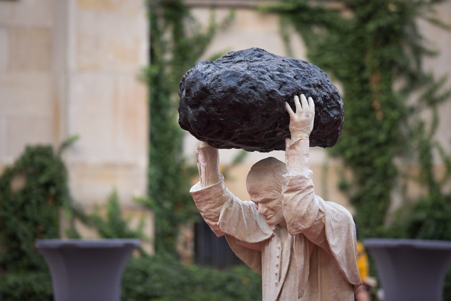 One artwork that demonstrates this stance was unveiled at the end of September at the National Museum in Warsaw. The latest commission in the museum’s courtyard is a sculpture of Pope John Paul II by a Polish artist Jerzy Kalina. The commemorative piece, titled “Poisoned Well” (2020) (on display through November 8th, 2020), portrays the pontiff as a supernatural titan holding a meteorite as if attempting to throw it into a red pond surrounding him. It evokes a feeling of déjà vu, and rightly so. Kalina’s sculpture is a riposte to Maurizio Cattelan’s famous piece showing the same pope crushed by a meteorite, “La Nona Hora” (1999). When first displayed in Poland at the Zachęta National Gallery of Art in 2000, “La Nona Hora” caused public outrage because of its seemingly blasphemous nature. The installation was damaged and the gallery’s then director, Anda Rottenberg, was forced to resign.