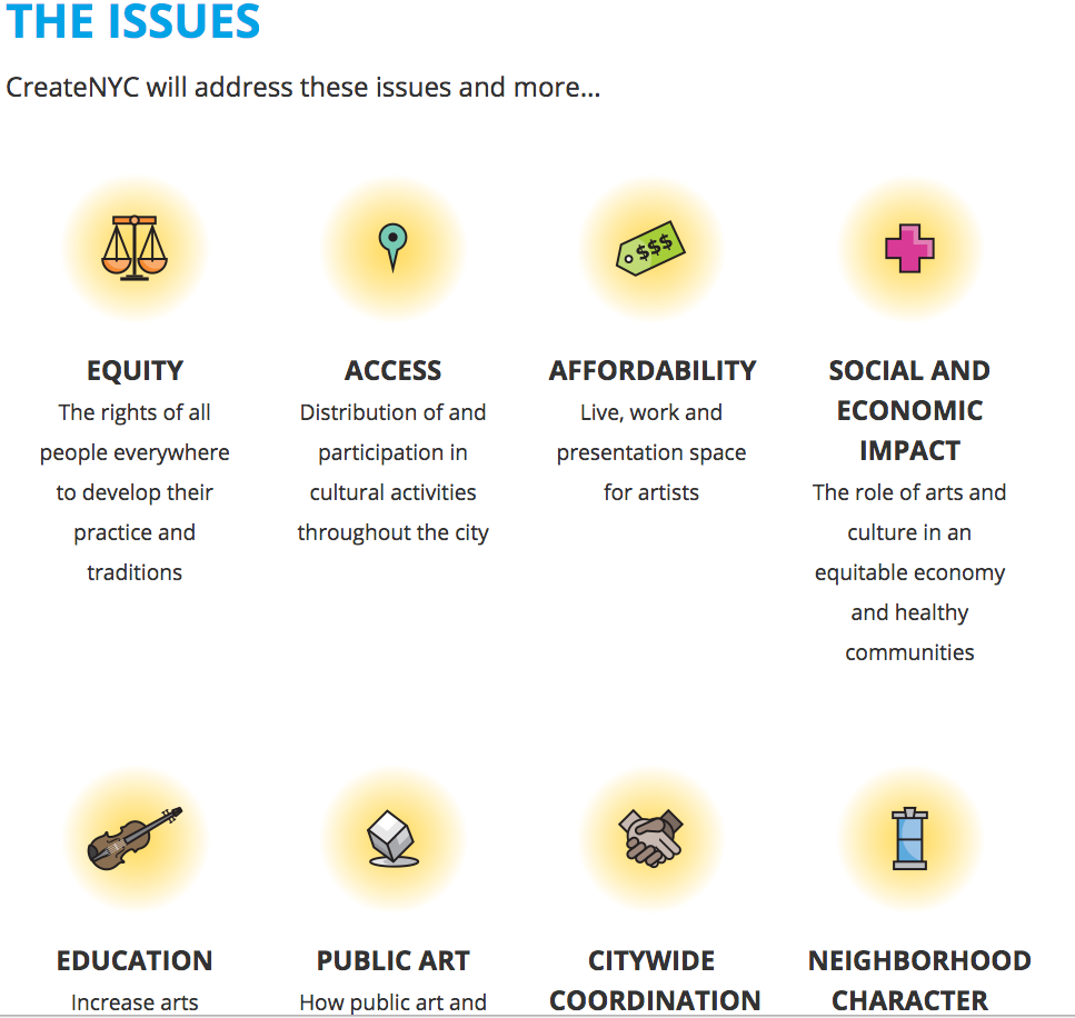 Last year, the City Council of New York passed a law mandating the city’s Department of Cultural Affairs (DCLA) to devise a plan that would manage and organize the city’s resources for arts and culture. In pushing for its creation in 2015, Mayor Bill de Blasio cited the fact that the city had never produced a comprehensive organizational scheme before, while other major American cities have. Pursuant to legislation, this cultural plan branded Create NYC has to be submitted to the council by June 30 of this year. It is now in its second phase of development, the “Public Engagement” stage, after the DCLA conducted research on how other cities (which include Chicago and Boston) have implemented similar initiatives.