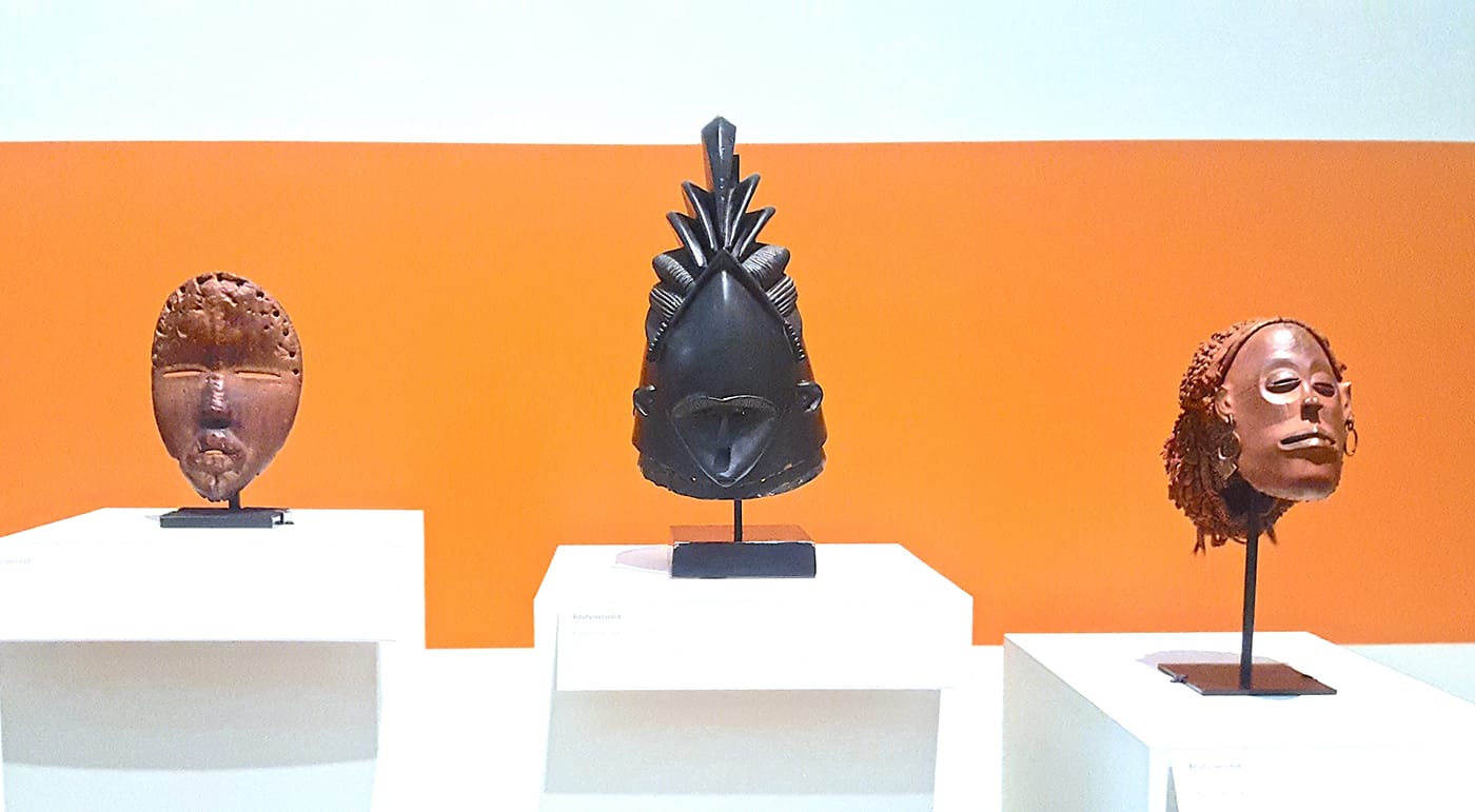 Installation view of three masks attributed (from left to right) to the Dan people of Côte d’Ivorie and Liberia, the Mende people of Sierra Leone, and the Chokwe people of Angola, the Democratic Republic of the Congo, and Zambia
