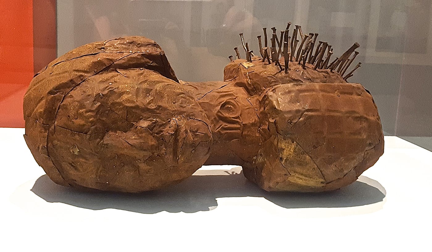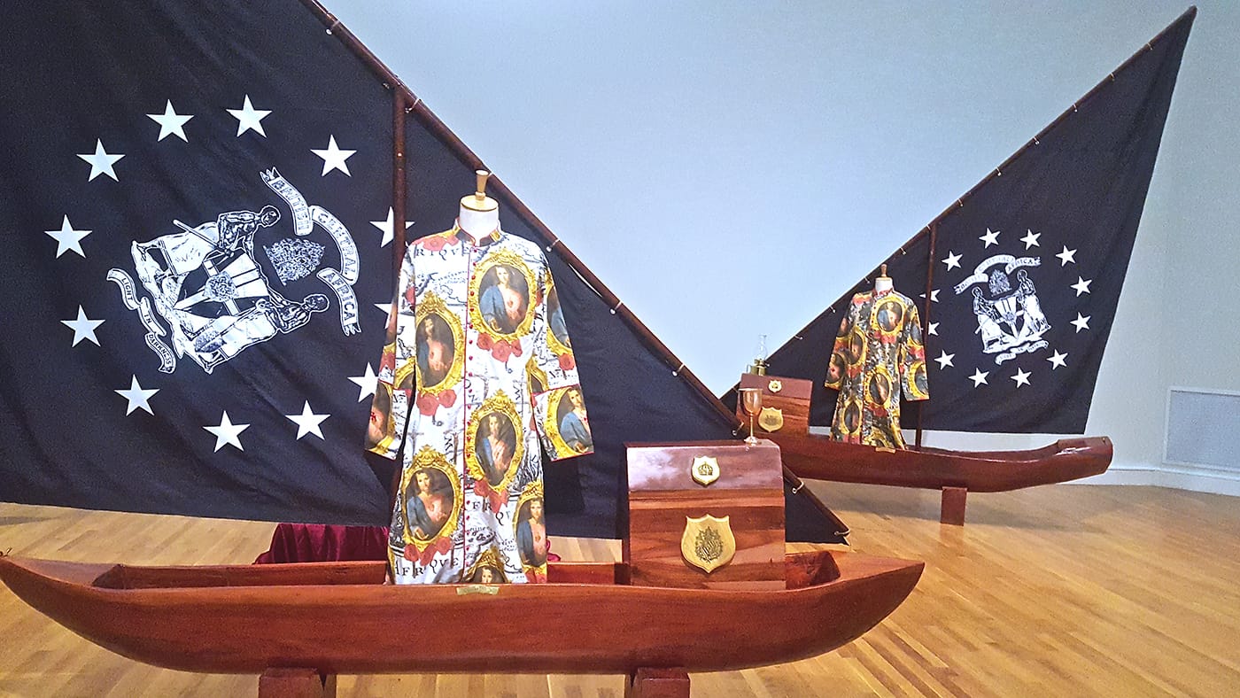 These are just a few highlights from an exhibition packed with arresting artifacts and major names, including a Kehinde Wiley work with a model posed in an iteration of an Obafemi Awolowo statue in Lagos against a background taken from Dutch wax print. There is a set of 2008 small collage works on paper by Wangechi Mutu; a stunning wood and metal statue by Alison Saar with obvious connections to the nail-driven nkisi nkondi figures of Central Africa; and a scene-stealing installation by Kudzanai Chiurai, “Leviathan” (2016) that features three wooden boats bearing dress forms in custom-printed fabrics, representing the cultural bleed between Africa and the Christian missionaries, who served as a spearhead for white (Christian) supremacy in Africa. For lovers of African art, old and new, or those looking for some of the most poignant and beautiful thought leadership on contemporary ideas of African identity and art, Beyond Borders at UMMA is a must-see.