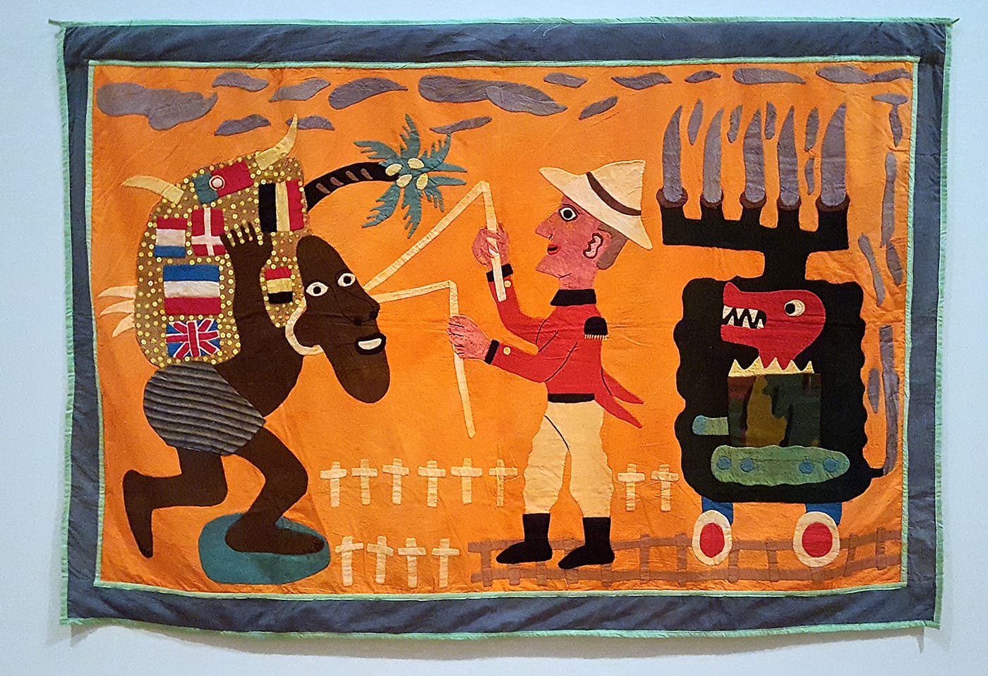 There is an absolutely stunning example from the 2009 series, The Black Ocean, by William Adjété Wilson, which riffs on the traditional medium of Asafo flags, made by the Fante people of coastal Ghana for some 400 years. In Wilson’s flags, which cannily pick up the numbering system by which different Asafo trade companies identified themselves, colonial encounters are documented, using the same bright figuration in piecework as the original flags. The piece “No. 8, Colonization” depicts a African man with a rope around his neck, carrying an ungainly package on his back that holds a jumble of colonial flags, ivory tusks, and a coconut tree. A British figure is leading him past a graveyard of little white crosses, to the foot of a train track, upon which sits a mythological vehicle belching smoke and inhabited by what looks like a small dinosaur inside a camouflaged tank. The image is evocative and readable in its own right, but it is also instantly recognizable to anyone familiar with the practice of Asafo flag-making, and its history as a form of cultural resistance.