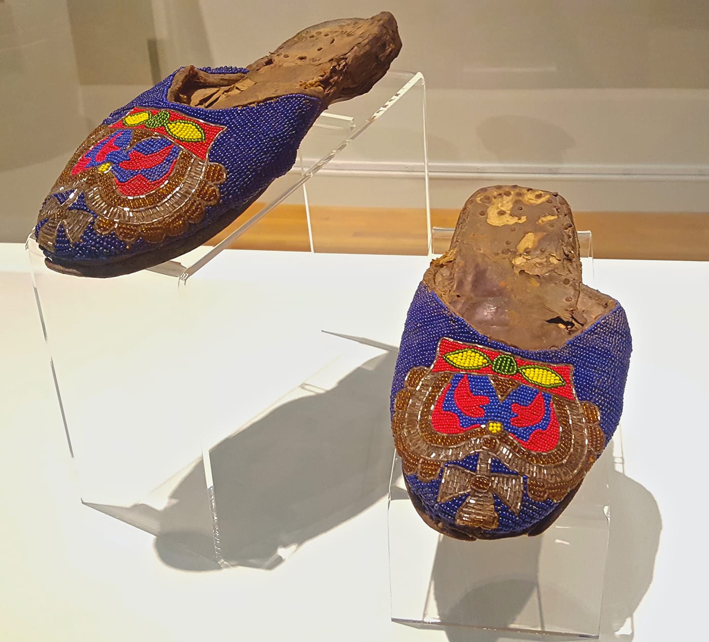 A pair of beaded shoes from the Yoruba people which incorporate the motif of the British crown; De Becker emphasizes that such cross-cultural influence is the hallmark of artistic adaptation and speculates that there are metaphoric implications to placing the crown on the foot of the Yoruba ruler who wore the slippers.