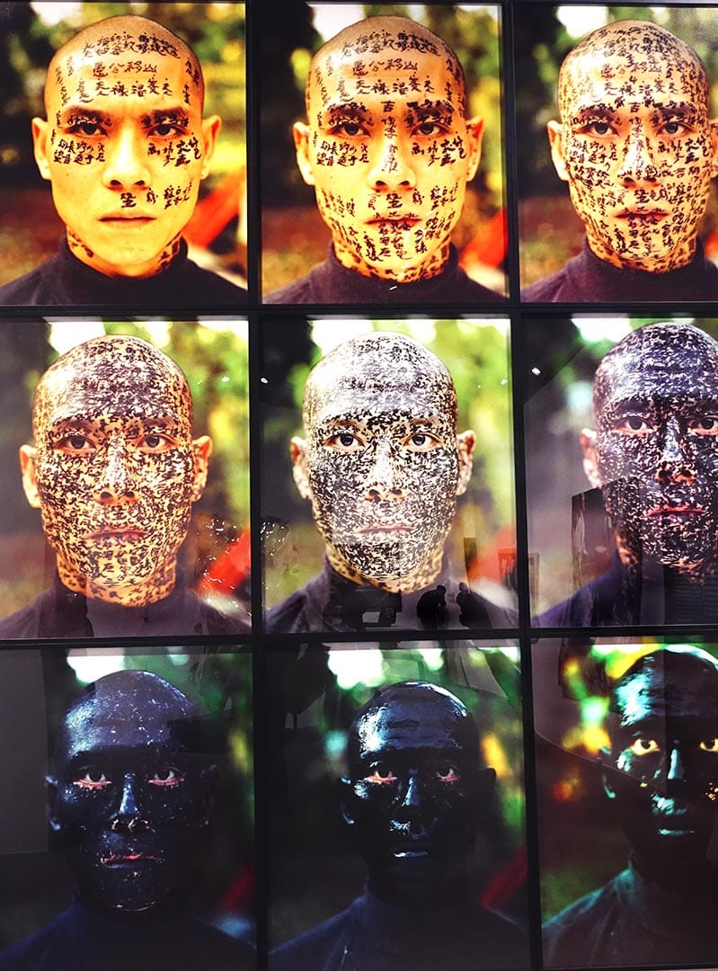 Artists continued using the body in performance, and the exhibit includes framed shots of Song Dong’s 1996 “Breathing, Tiananmen Square,” and “Breathing, Houhai, Back Sea,” where he crawls on the cold, bare ground as ice vapor steams from his breath. Zhang Huan and other artists piled naked on top of each other for the 1995 performance “To Add One Meter to an Anonymous Mountain,” adding one meter to the Miaofeng mountain’s height. Huang continued using his body in “Family Tree,” where cultural references from his country and ancestors were applied in calligraphic layers on his face with ink.