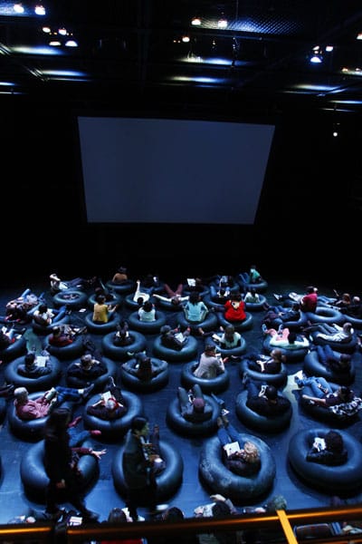Coco Fusco’s piece, “Y el mar te hablará (And the Sea Will Talk to You),” again challenged the audience/performer relationship. Tens of large rubber inner-tubes made a kind of grid across the wide and deep playing area of the Fishman Space (which, for those who haven’t been in it yet, resembles a larger version of Dixon Place’s space — a wide deep playing area with flexible seating that can be configured in a variety of ways, with a thin mezzanine level above that wraps around the entire playing and seating area). You could sit in one of the inner-tubes, as I did, or you could sit back in either the traditional riser seating or up in the mezzanine. Above the inner-tubes hung a large projection screen suspended at a downward angle so that those of us low to the floor and close to the screen could both see and feel in some ways dominated or washed over by the watery imagery on the screen.