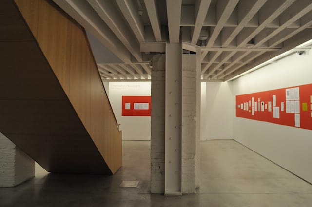 The architectural renovation subtly expanded the space by a few feet here and there by using what Weisz called “found space,” referring to the gains they made by lowering the floors in the basement or removing excess wall coverings or columns. On the lower floor the irregularly shaped piers of the building are exposed and the ceiling beams are original and reused. There is a sense of the history of the space being revealed by the renovation process, and visitors familiar with the old Drawing Center with certainly remember the fluted Corinthian columns and large storefront windows that retain a sense of continuity with the space’s history.