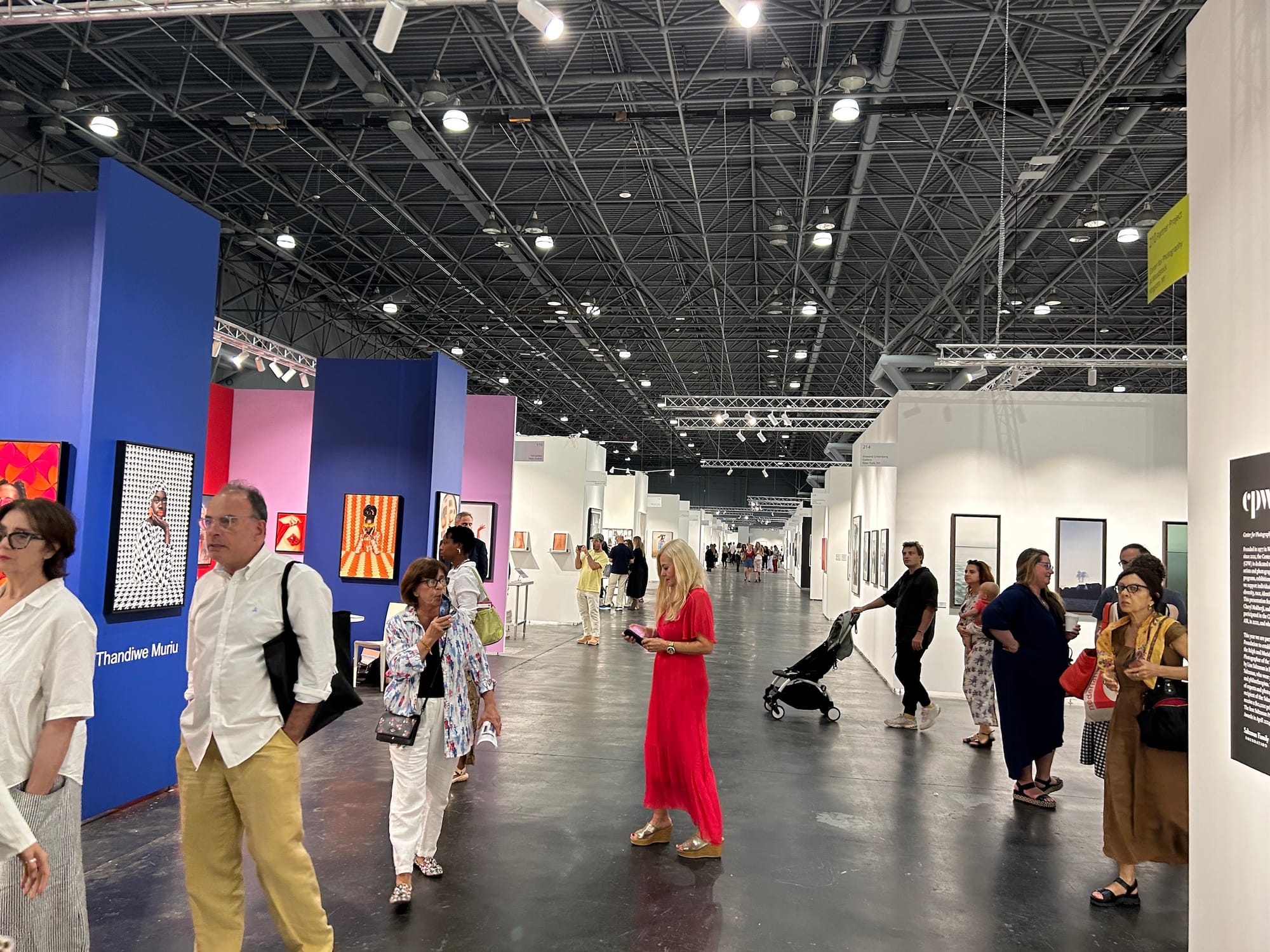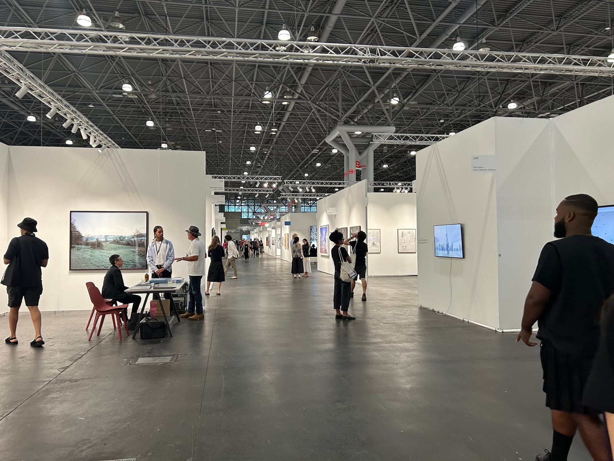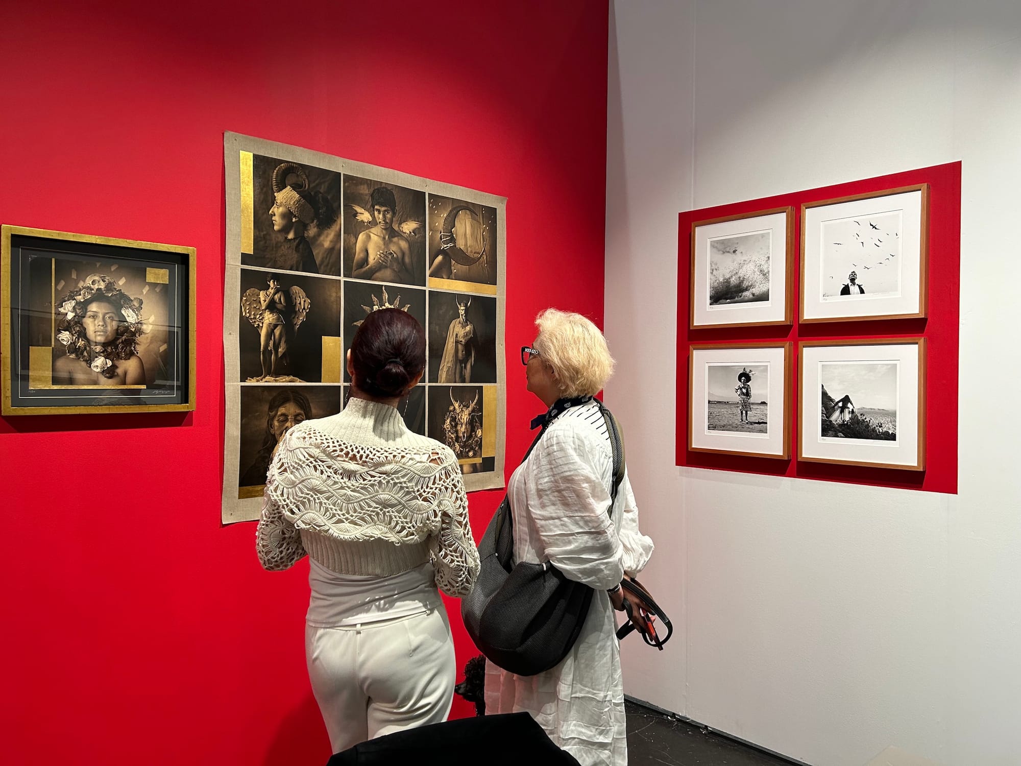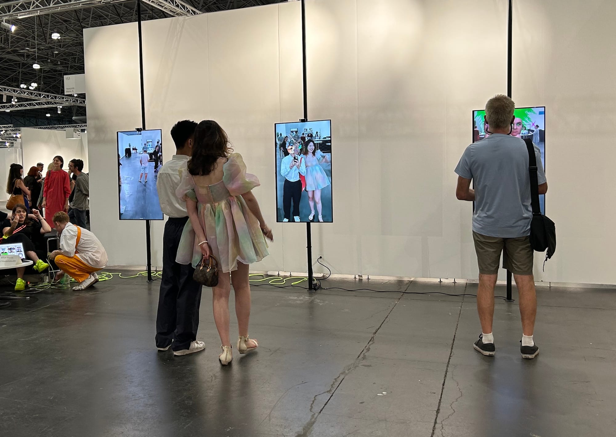 Continuing on into the fair, I weaved in and out of booths, trying to keep an open mind, especially when I saw the interactive photo booth experience featuring generative artworks from Huntrezz Janos that felt more like a life-sized TikTok video. I was drawn to Emanuel Hahn’s display of photographs from his ongoing American Fever series that explores the intersections of the post-war Korean immigrant experience and romanticized ideals embedded in Hollywood cinema and the mythological American West. In talking with Eric Hart Jr., whose stylized black-and-white portraits invert notions of heteronormative Black masculinity with illuminated acrylic nails and lacy parasols, the New York-based artist explained how while he continues to use monochrome digital photography as his primary medium, he also has begun warily exploring the ways AI can help grow his own art, such as in mood-boarding and sketching.