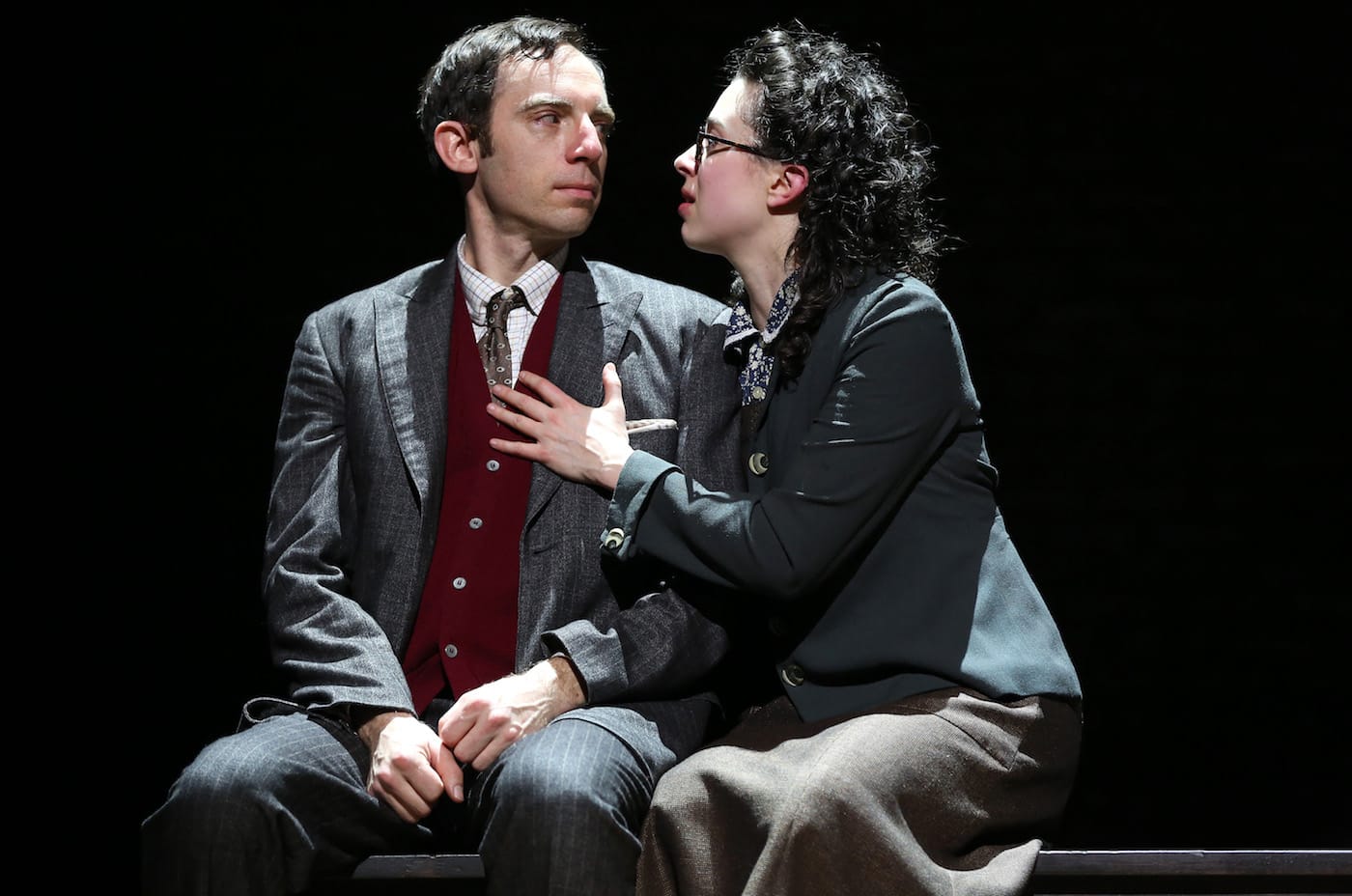 Vogel’s play begins with sawdust pouring out from the sleeves of the stoic men and women as they stretch and contort themselves into images of pain, sorrow, and grief. The dust settles on the floorboards of Broadway’s Cort Theatre for only a brief, melancholy moment before joyous dancing kicks up the particles. Klezmer music fills the air and suddenly we are in Poland, listening to Asch (played by Max Gordon Moore and Tom Nelis) as he eagerly awaits his wife Madje’s (Adina Verson) first impressions of his intrepid play. “My God, Sholem. It’s all in there. The roots of all evil: the money, the subjugation of women, the false piety,” she exclaims, “You make me feel the desire between these two women is the purest, most chaste, most spiritual—” Asch cuts off his wife with unrestrained enthusiasm and starts planning for productions across the world — Moscow, Paris, and Budapest await.
