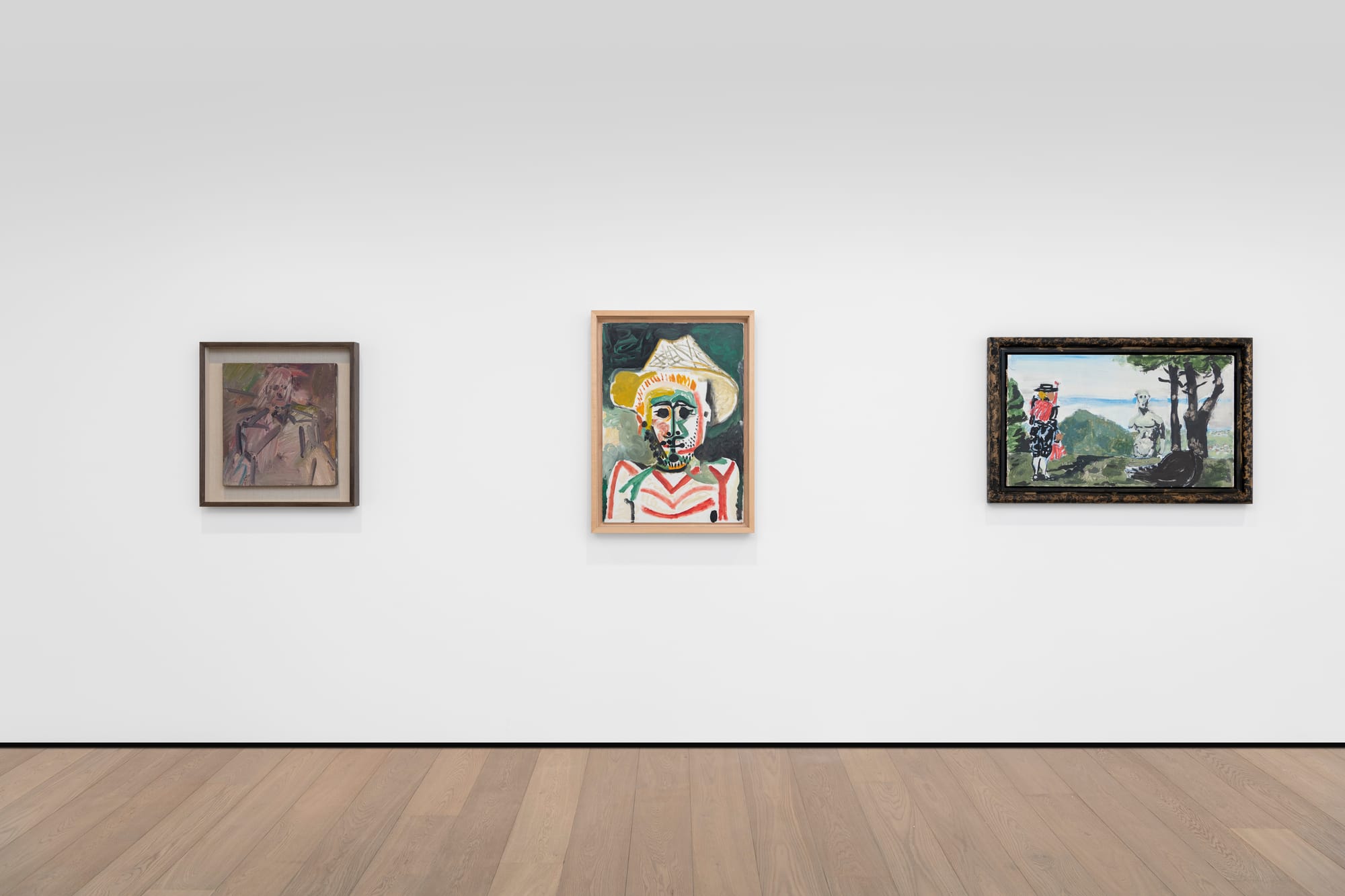“Hello and Goodbye” hangs cleverly next to works that also focus on line-making. The shoulders, torso, knees, and head in Frank Auerbach’s portrait, “David Landau Seated” (2013–15), emerge with dark, angled brushstrokes from a sludge of pastel-colored paint. Haunting, hollow eyes and an expressionless face match the mask-like figure in Picasso’s “L’Homme au chapeau de paille” (1964), one of the exhibition’s only paintings not created in the past couple of decades, but included for its influence on the others. Picasso’s dashes and dots denote stubble on the man’s face and texture in his straw hat. His upper body is formed from bone shapes, as if we’re seeing through to his skeleton. A. R. Penck takes this pictographic style further in “Plato, Sokrates und Aristoteles – 6” (1996), which is made up of Keith Haring-esque bold black lines on an off-white background. Penck creates a compelling labyrinth of human bodies, faces, and eyes, along with circles, stars, and triangles. A huge figure, for example, slumps down the left-hand side of the canvas, with its legs stretching along the bottom; inside, are the silhouettes of three smaller bodies, all in the same position, sprouting eerily from each other. Less evocative among this group of paintings is “Vision des Poussin” (2012), a rural landscape by Markus Lüpertz; yet it has the same sunken eyes (here, they appear on the head of a Renaissance statue, positioned incongruously beneath the canopy of a tree), and swirling pencil lines peek out from under blocks of bright color.