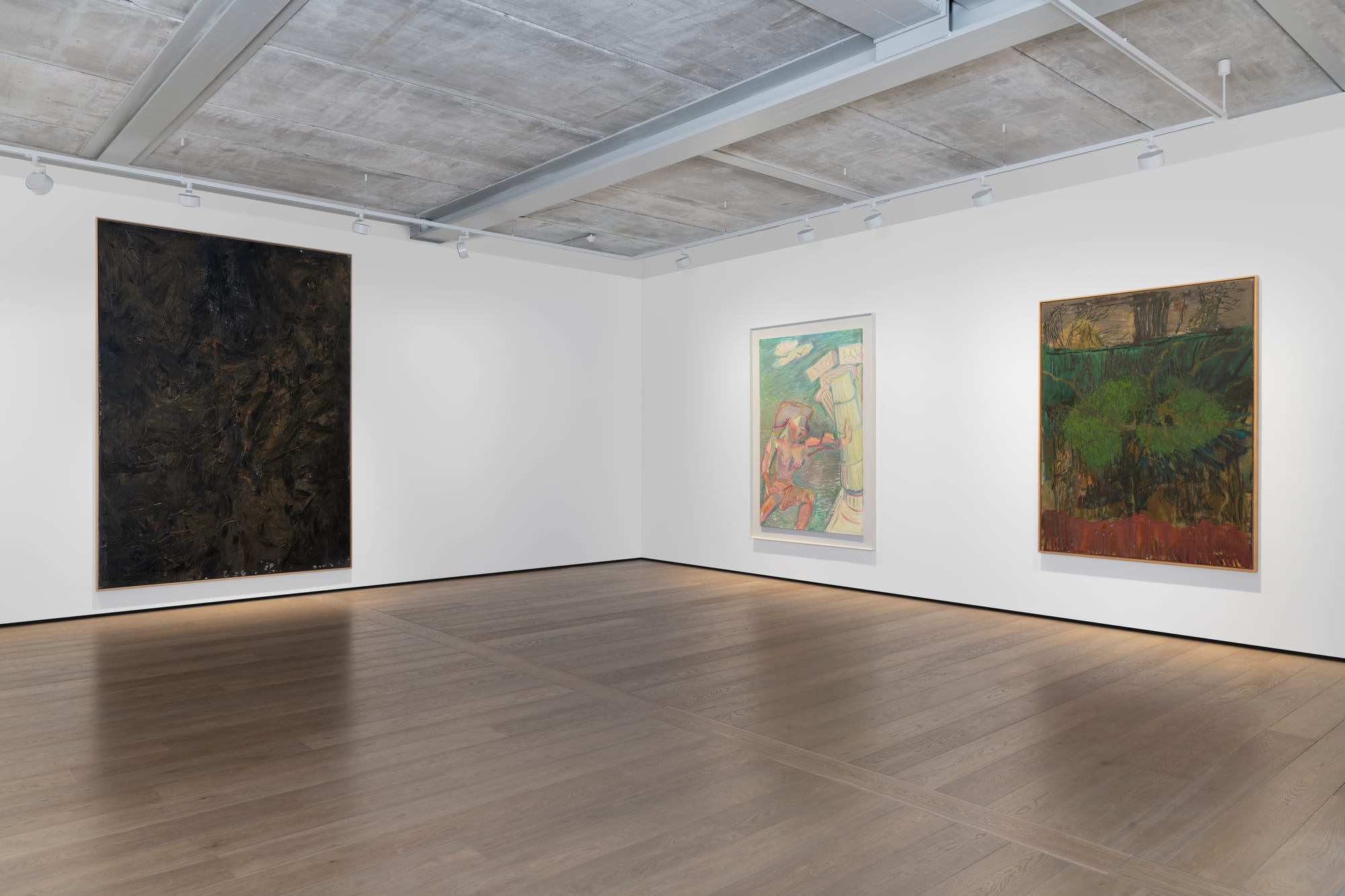 A large black and brown painting by Georg Baselitz dominates the second room. Unlike his signature upside-down figurative work, “Wo ist die Haselnuß?,” completed in early 2018, is a chaotic mass of built-up and thinly-spread paint, contoured across the canvas with a wide palette knife. In a 1995 Artforum interview, Baselitz said that his art is informed by having been brought up in Germany after the Second World War: “I was born into a destroyed order, a destroyed landscape, a destroyed people, a destroyed society. And I didn’t want to re-establish an order: I had seen enough of so-called order. I was forced to question everything.” He takes this sentiment to an extreme in this new painting.