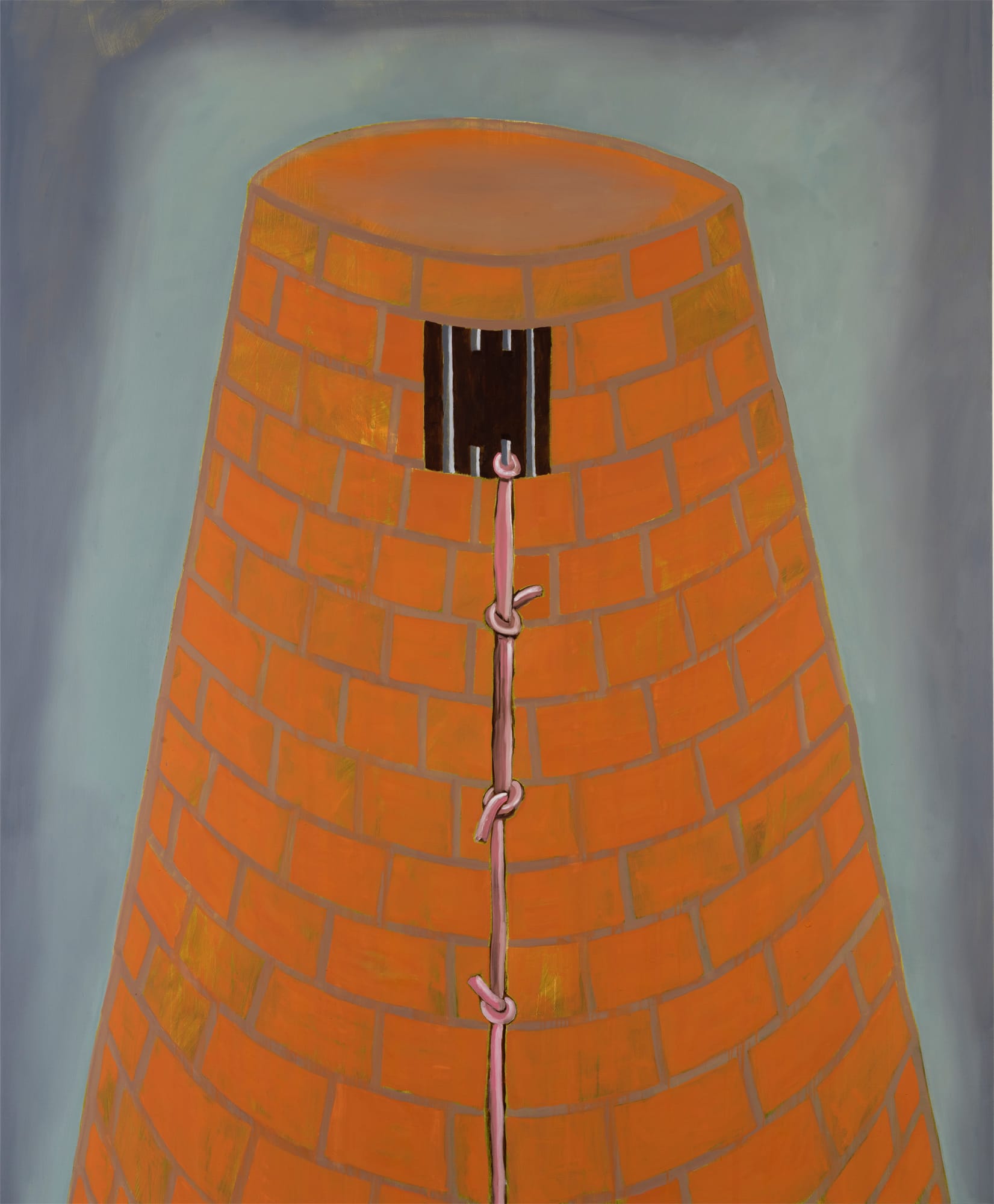 Biblical stories and the supernatural guide many of the other works in this room. “Ascension IV” (2015), an inkjet print modified with ink and spray paint by Julian Schnabel, is an aerial view — perhaps of the earth, the moon or a rock — obscured slightly by a purple haze; the result is like something out of a science-fiction film. Susan Rothenberg’s “Pink Raven” (2012) could be an illustration for Edgar Allan Poe. The scrawny, pinkish bird balances precariously on a green wire; one foot hooks on, while the other looks ready to lash out. Rothenberg has left faint marks next to the raven’s back, as though it is blurred in movement. And in “Samson” (1983), Maria Lassnig inverts the strength of her subject — clad in armor, pushing over an ionic column — by using a light-hearted palette of pale blues, pinks, yellows, and greens. Cartoon clouds and a V-shaped bird float in the left corner.