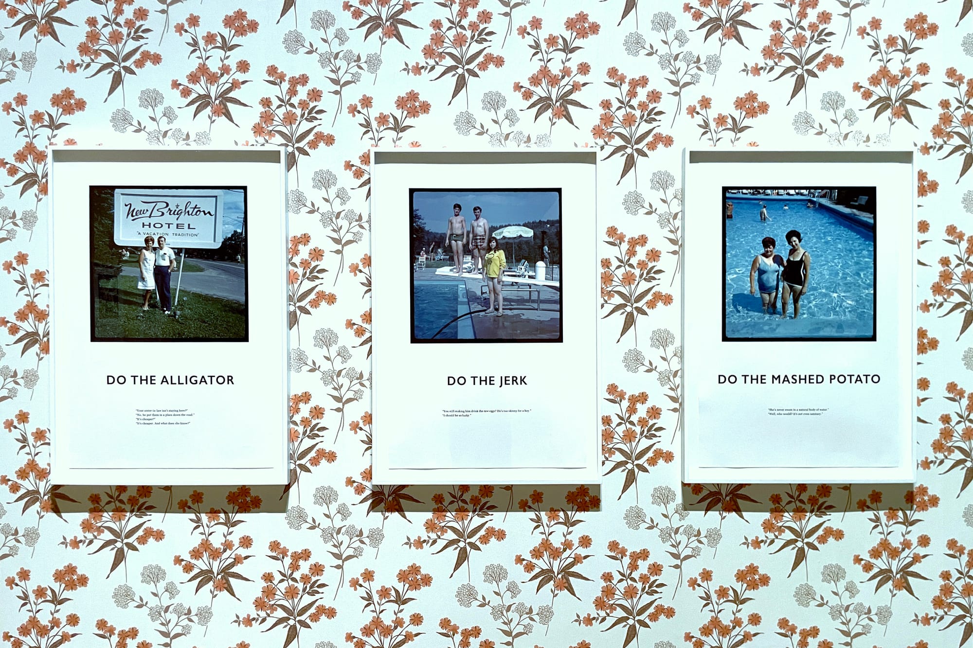In the photo series Dirty Dancing (2017), which makes up the majority of the exhibition, Futernick blows up old slice-of-life photos, like her then-teenage uncles posing on a diving board, and her grandmother looking up from her Mah Jongg quartet. In “Do the Twist,” just below a photo of a man mid-dive, floating above unbroken water, are two lines of dialogue on a simple white background: “‘The fish is dry.’ ‘But they give a good portion. I like a nice portion.’” There are no attributions to the text, but one imagines they come from two women sitting on a white bench in the background. The simple exchange taps into the highs and lows of budget-conscious travel, of a class that could afford a vacation, but not luxury.