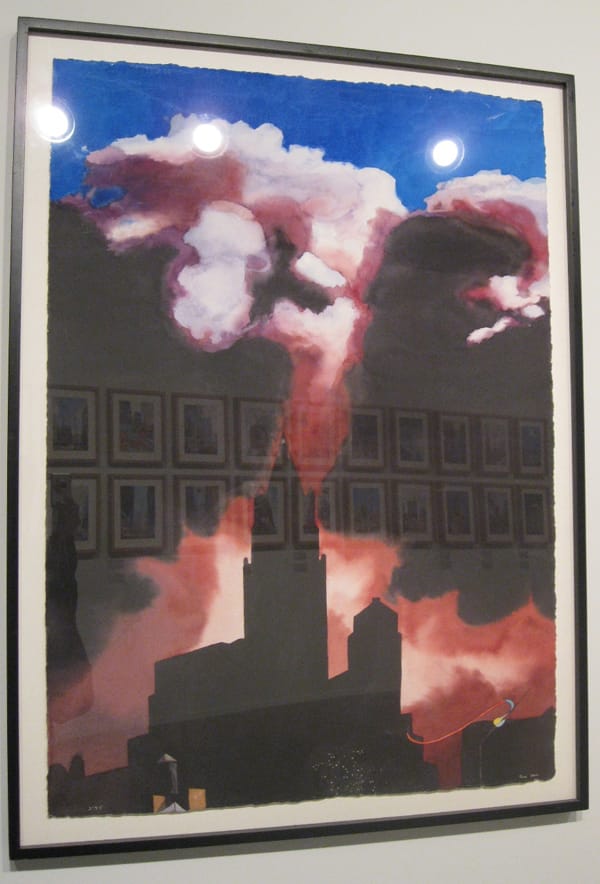 In others, the footprints of the massive memorial fountains emerge out of the ground that was once a wasteland. Stone’s impressive use of watercolors in some works adds to the ephemeral nature of his subject. There is a translucency to the watercolors, so that images appear to simultaneously materialize and dissolve. In his time-lapse renderings of the events that occurred on September 11, thick clouds of gray, white, black and red smoke are ethereal, yet terrifying. The watercolors in these pieces lend an element of texture and dynamism that is absent in Stone’s flat oil paintings.
