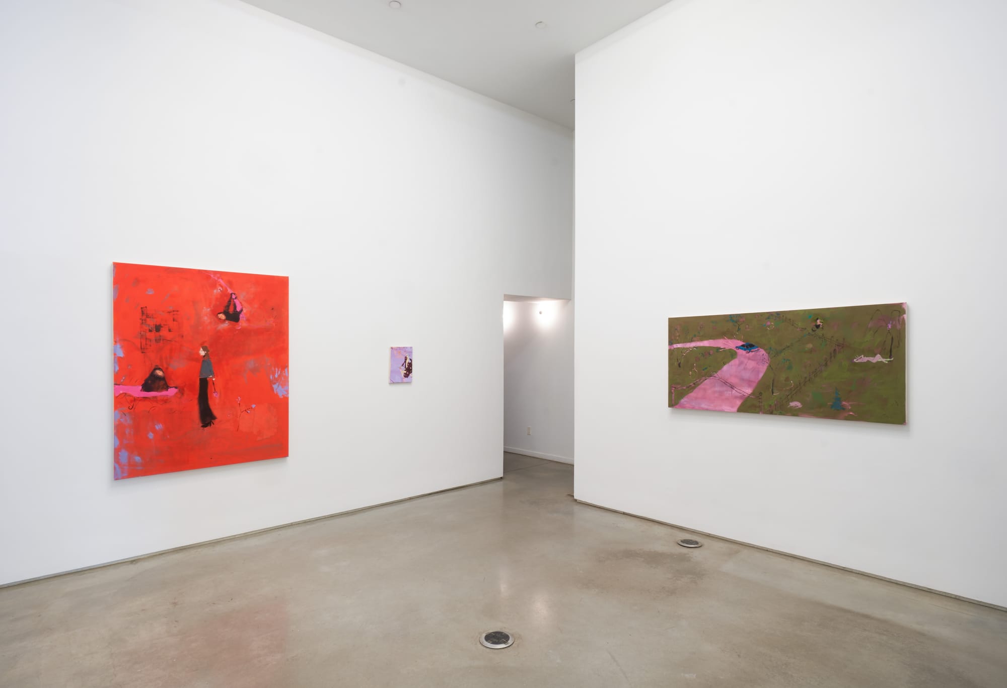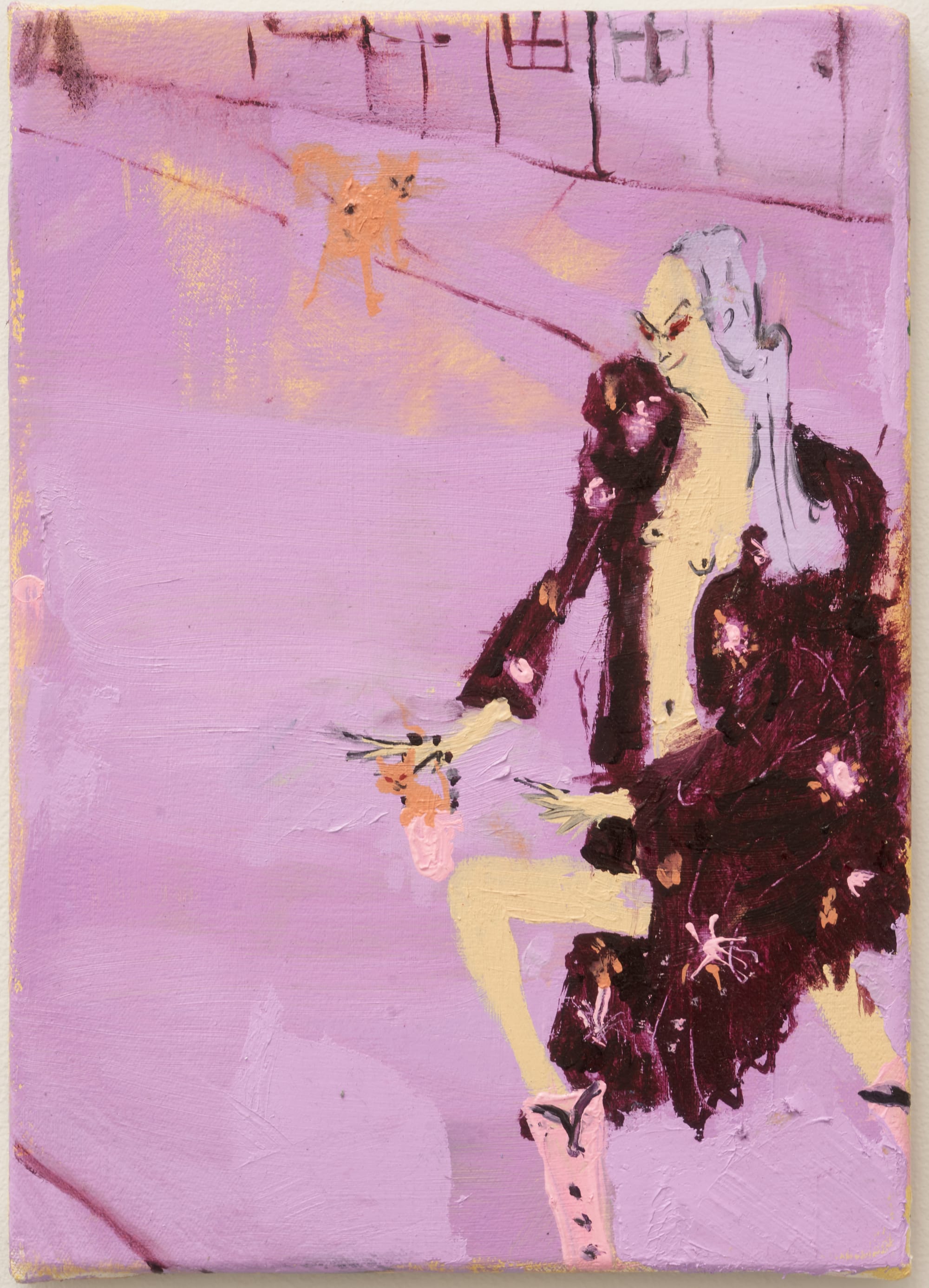 The most enigmatic painting in the show is a small untitled oil on canvas from 2019. Here, a fiendish figure wearing a decadent Aubrey Beardsley-style robe, revealing small breasts, and holding a cat in a purse seems about to take a decisive step. The figure poses against a bubblegum-pink backdrop; another cat in the background raises its tail and bares its anus. Close inspection of the figure shows the face to be strongly reminiscent of pioneering drag artist Divine. Is Divine an object of resentment or another object of the gaze, but one who refused to be caged in by cliches of beauty and propriety — one who offered an alternative freedom to women and men alike?