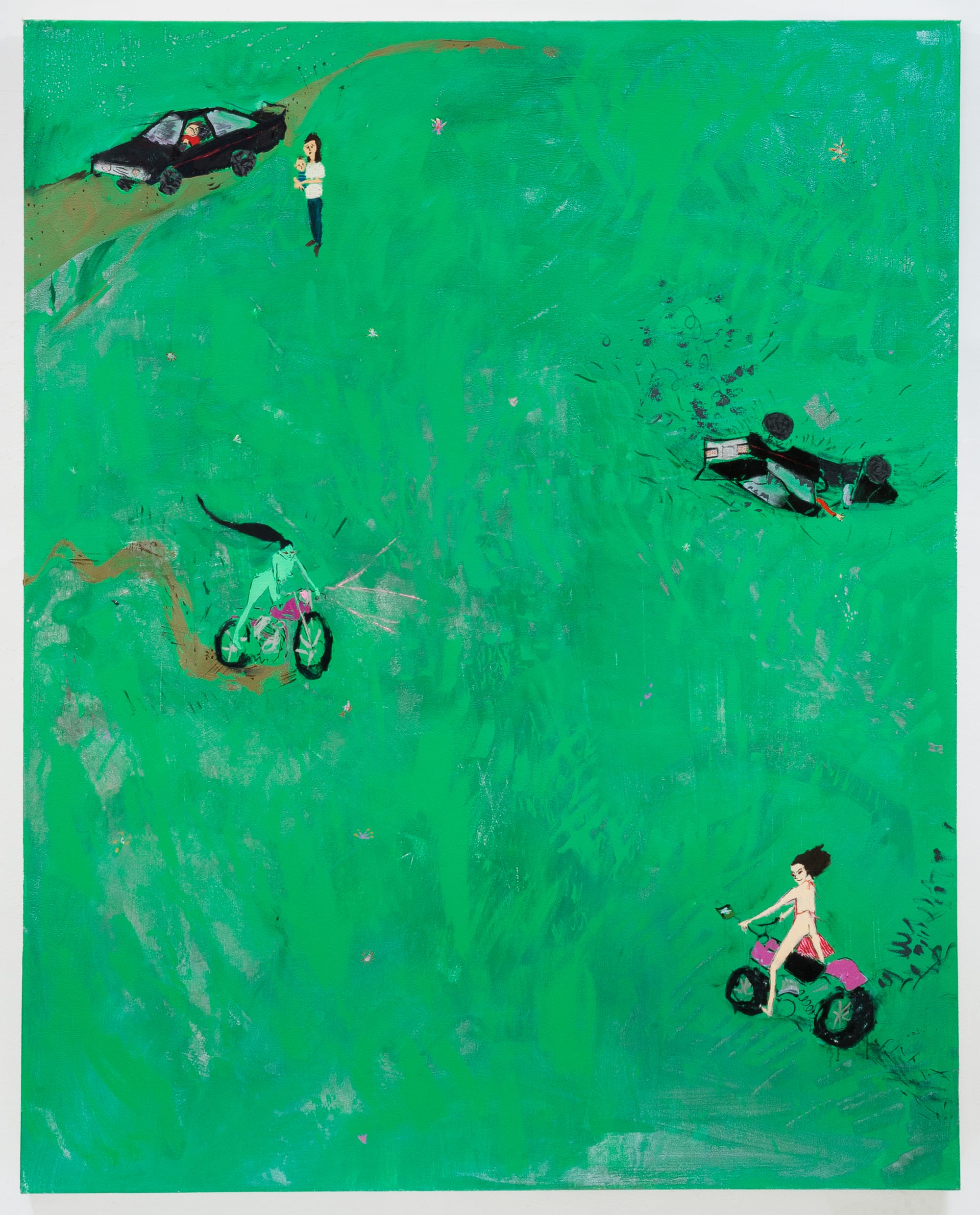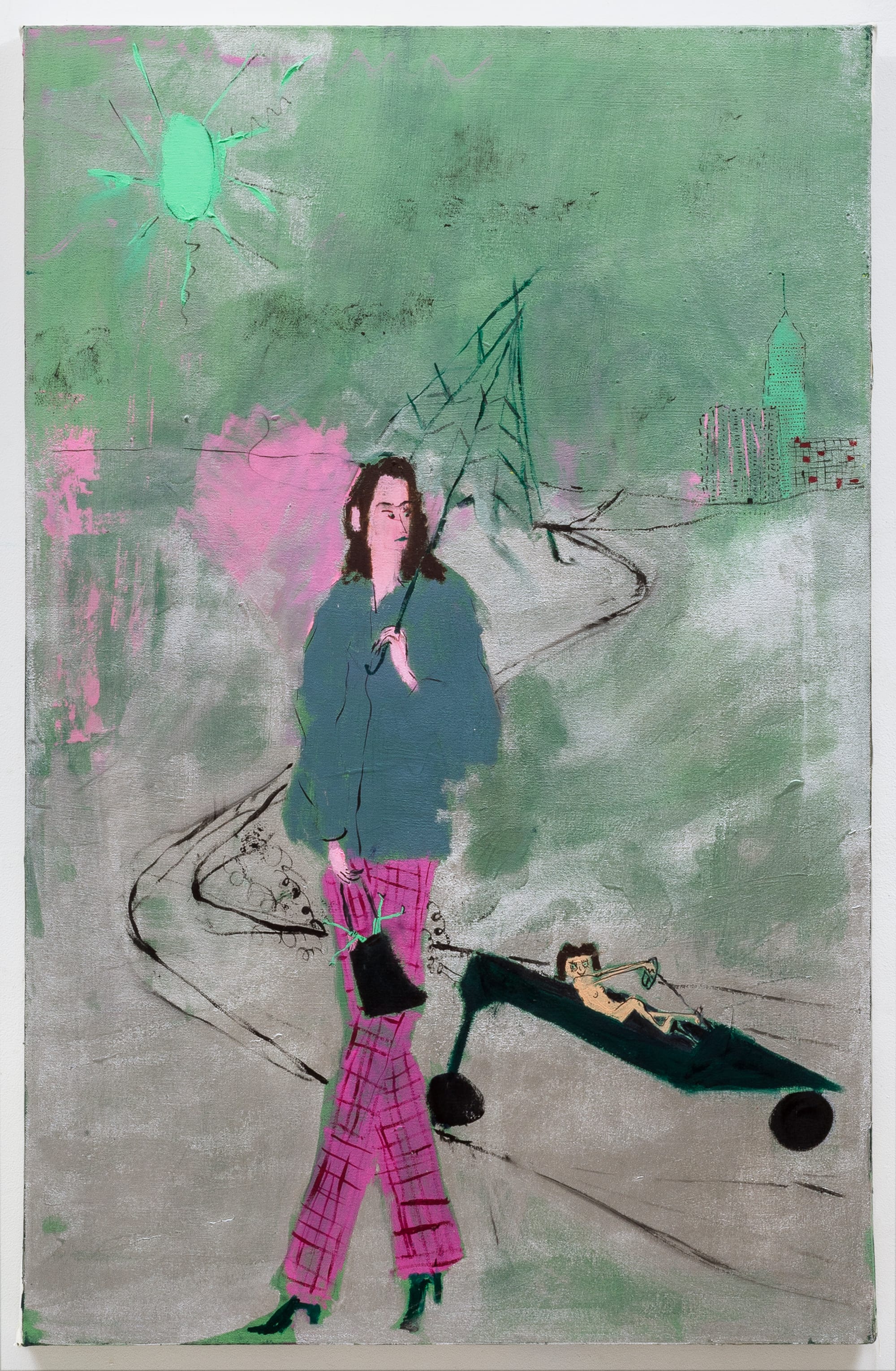 McKendrick develops more of a narrative in another untitled painting from 2018, a 60 by 40-inch flashe and oil. In the upper left, a man in a car ogles a woman holding a child in her arms while in the lower right the car has overturned and the ogler is pinned under it. Female figures in the painting cavort on motorbikes, owners of their own destiny, free because they possess their own agency. Vehicular freedom reappears in another “Untitled” from 2018 in which a posed model is stared at by a tiny, naked female grotesque driving a car that looks like a stiletto heel. The painting suggests that transcending resentment is only possible when one has the reins in one’s hands, when one is the driver. This is underscored in an untitled painting of an open road, the broad pink highway standing out against the muddy, greenish-brown ground, seemingly merging vaginal and phallic sexuality.