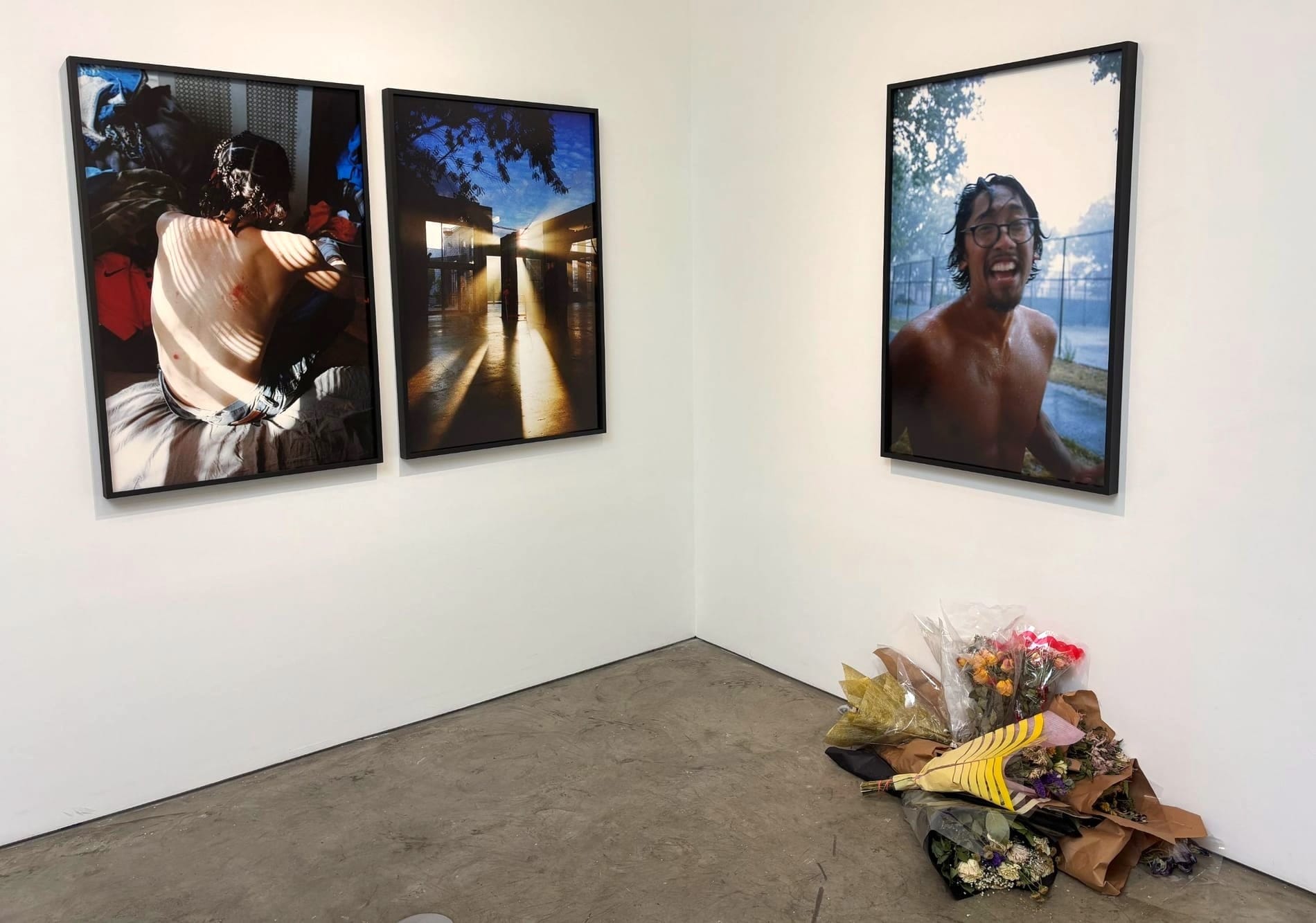 What makes the photographs in Hard Feelings so affecting is how they were produced. Only through trust built and tested over time could Majd have captured such tender moments of those he now calls family. Many of his friends came to the opening in February, gifting him armfuls of flowers. Those bouquets became an impromptu installation placed below the show’s final image, a portrait of Suba, Majd’s close friend who passed from an accidental overdose in 2020, and to whom this show is dedicated. The flowers were wilting when I visited in late March, but no less beautiful. Above them, Suba radiates the most infectious smile. Even in death, he’s alive.