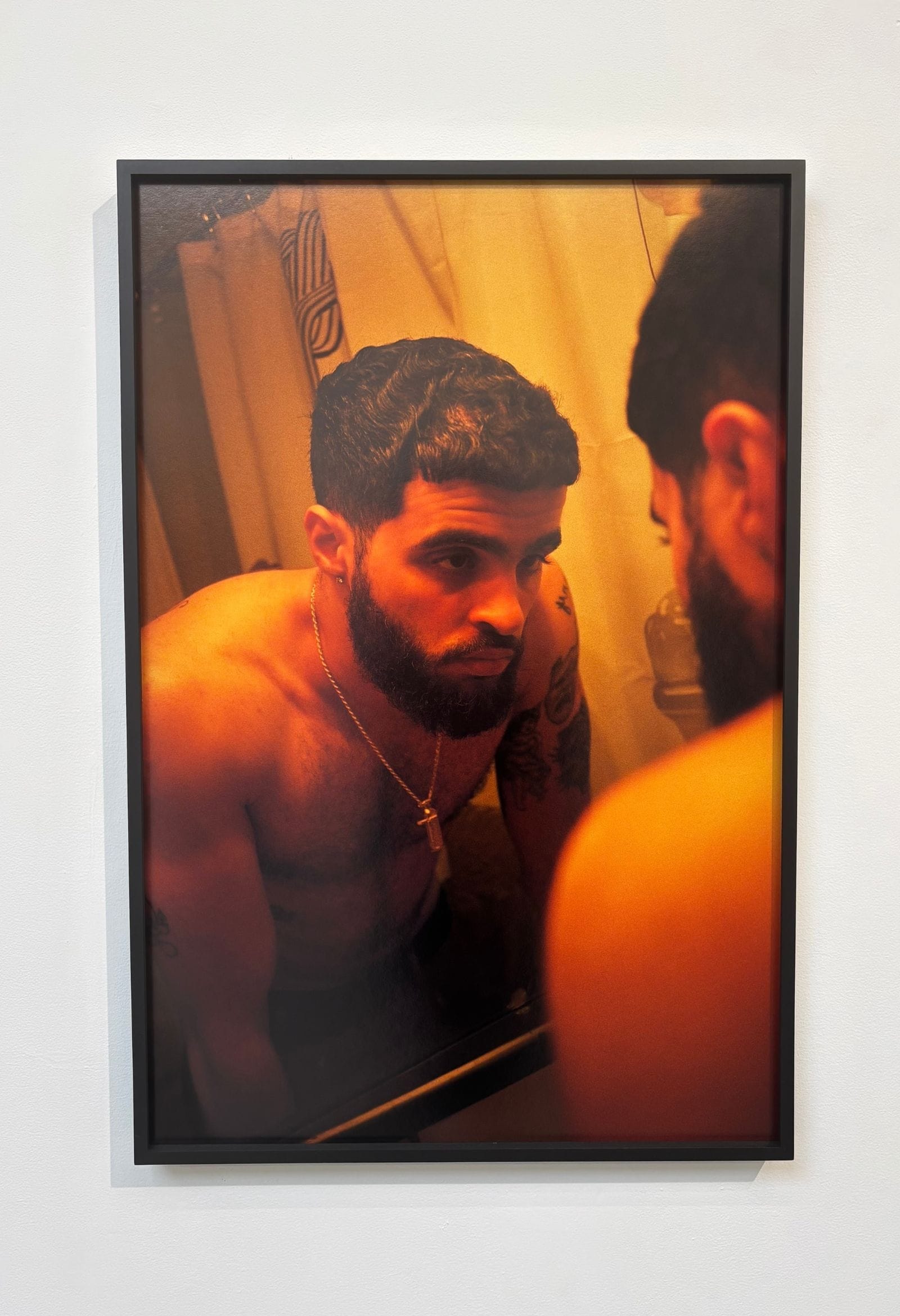 While many of these works focus on interiority, the personal is political; Majd’s experience as a Palestinian American is subtly embedded throughout the show. In “dallas (phoenix ash)” (2021), an Egyptian man enveloped in yellow-orange light looks at his double in the mirror. A private, contemplative moment becomes a surrealist portrait reflective of broader systems, including the impact of state violence on Arab communities and the internalization of that violence by men in particular. This image, like Rissa’s portrait, asks us to confront our complicity in such systems of harm.