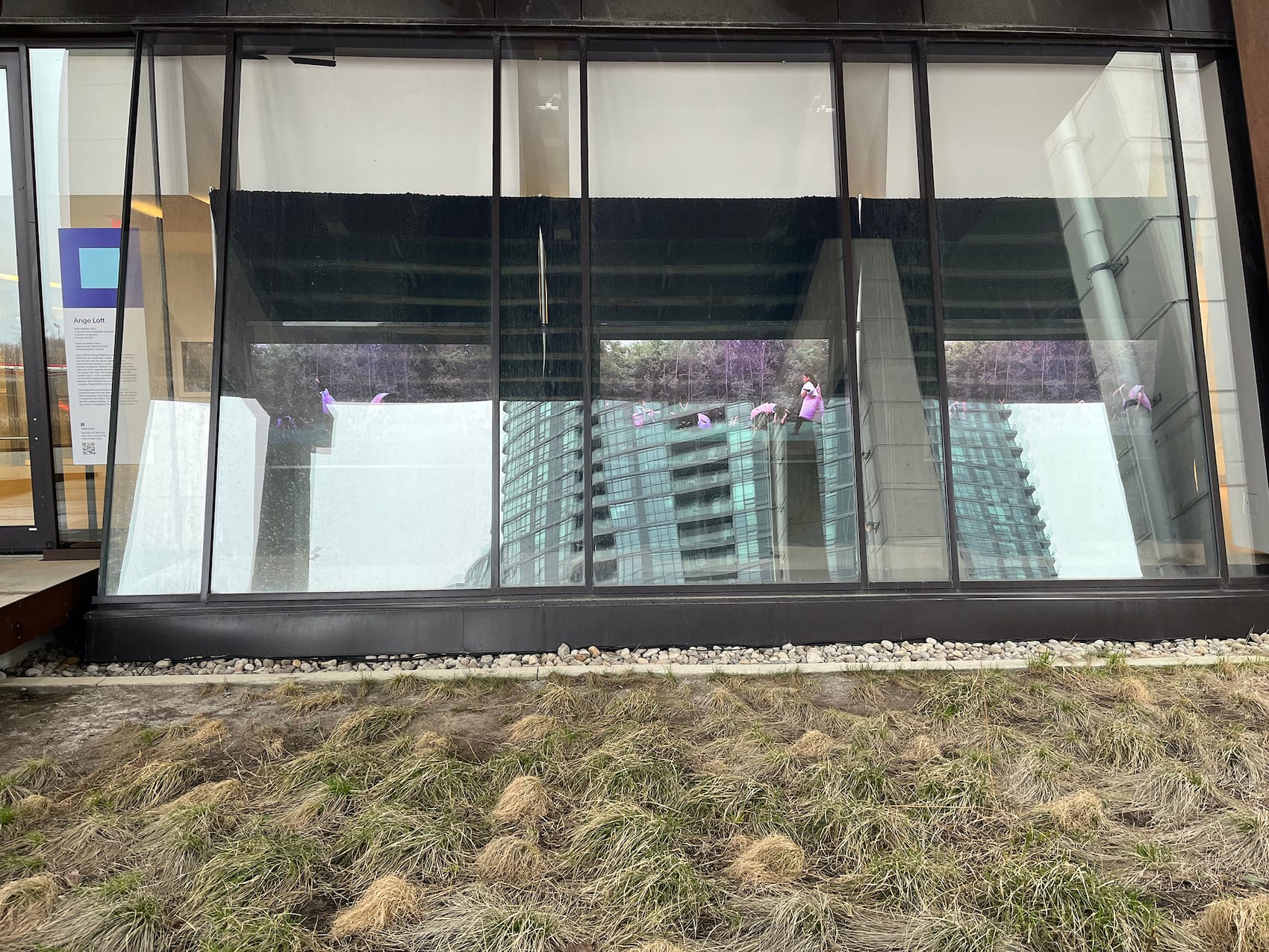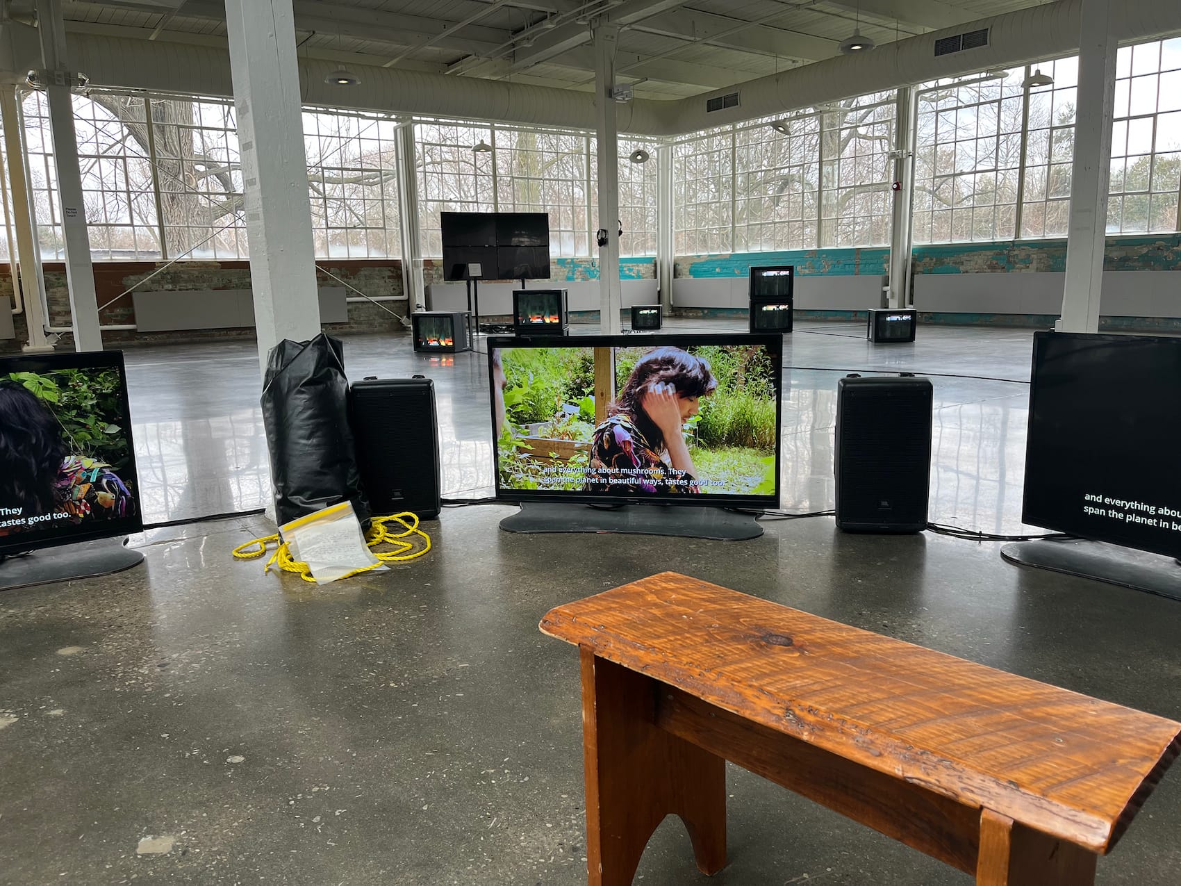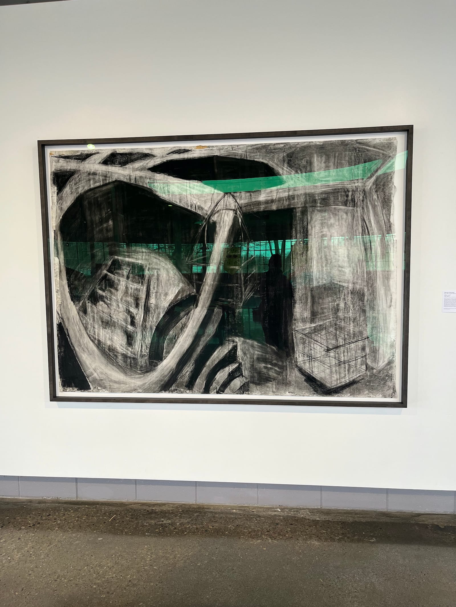 Worst, the building’s airy windows created unfortunate reflection issues that distract from an otherwise absorbing trio of framed Denyse Thomasos charcoal works and the CRT monitors in an installation by Timothy Yanick Hunter, recently long-listed for the Sobey Award. (Never mind that upon my second visit the stacked free-standing LCD monitors within Hunter’s installation were off, with an apologetic “sorry … temporarily out of service” sign positioned in front. When I reached out to the Biennial’s PR for comment, I was told that the building has power issues and occasionally goes out, impacting the media artworks onsite: “the artist and curator have been aware of the situation.”) While I let my daughter crawl over a large coffee table in an adjacent empty cafe area, I felt that what stood out most was the exhibition site’s historical “character,” and how its architectural elements — like the steel factory windows — loomed too largely.