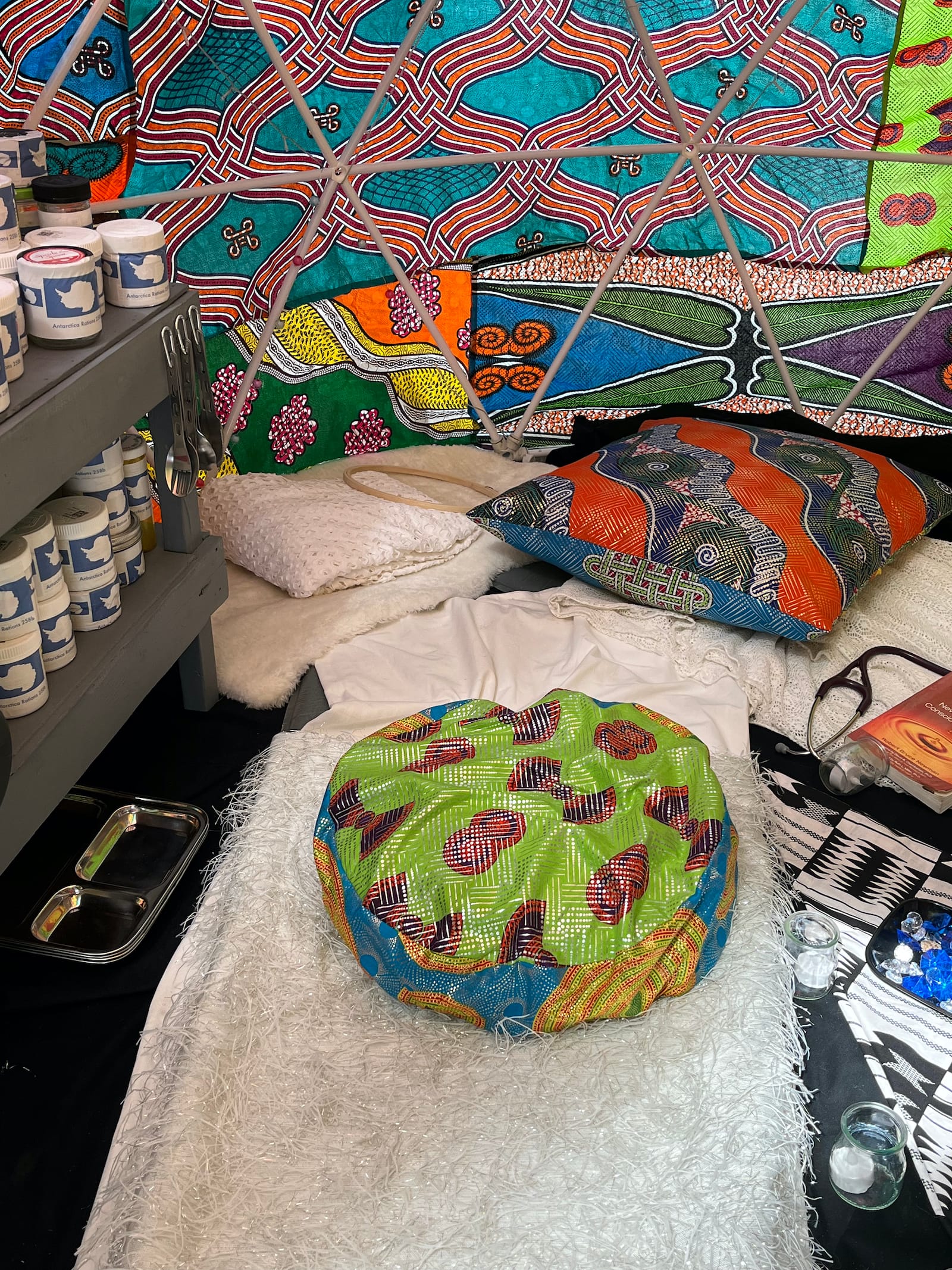 By the time I reached the biennial’s Perth location — a former Pentecostal church in the city’s west end — my attention to its challenges shifted toward the overextended curation. A key phrase in the biennial’s curatorial vision is “polyphonic histories”; the music theory term operates as a shorthand for a collaborative curatorial mode with curators, artists, and even literal forces of nature at its center. But with the exception of the well-situated Andrea Carlson and Nadia Belerique installations, which maximized the surrounding architecture, my eye got caught in the spatial layers of process-based methodologies. A corner library with shelves of research materials and even studies by some of the participating artists, a learning space with its own title wall extolling “collectivity” and “unlearning” as their programmatic tenets. Then, with the click of my phone, I can swipe through the plethora of contact-free interpretative materials: QR code-activated audio guides, a mobile art curriculum, a context brief, and a podcast series.