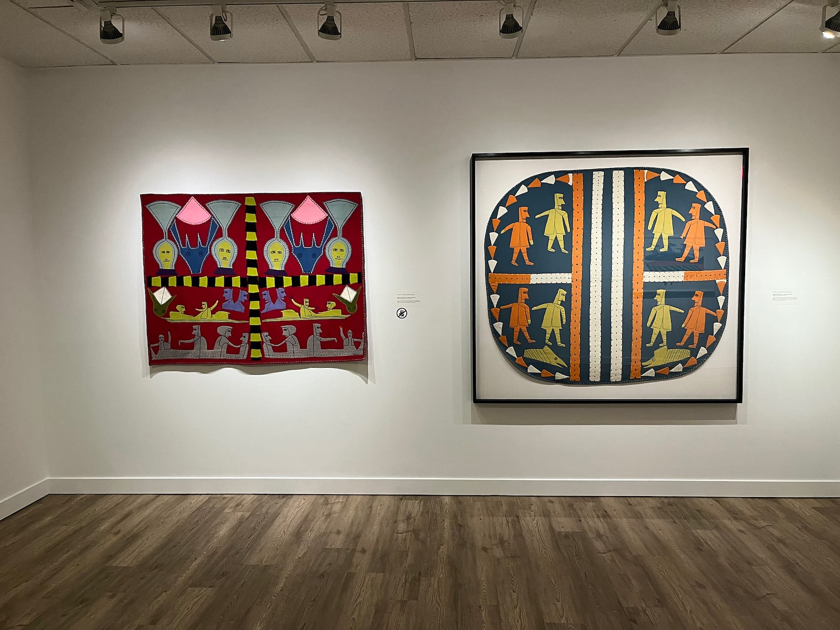 ᑕᑯᒃᓴᐅᔪᒻᒪᕆᒃ Double Vision: Jessie Oonark, Janet Kigusiuq, and Victoria Mamnguqsualuk, the Textile Museum group show, felt warm and considerate in its sharp focus on the nivinngajuliaat, Inuit applique wall hangings created by this matrilineal Nunavut dynasty. This time capsule — which I experienced sans child because I have a life partner, mother, brother, sister-in-law, and friends who generously allow me these minute shreds of freedom to see, think, and write about art — had just the right amount of works and a fine-tuned narrative running throughout the didactics, pitching scholarly inquiry on par with oral-based histories. Ideally, Double Vision would have been envisioned as the biennial’s anchor since its historical heft provides a genuinely valuable entry point: the decolonial centering of collaboratively made artistic production passed down from elders and kin.