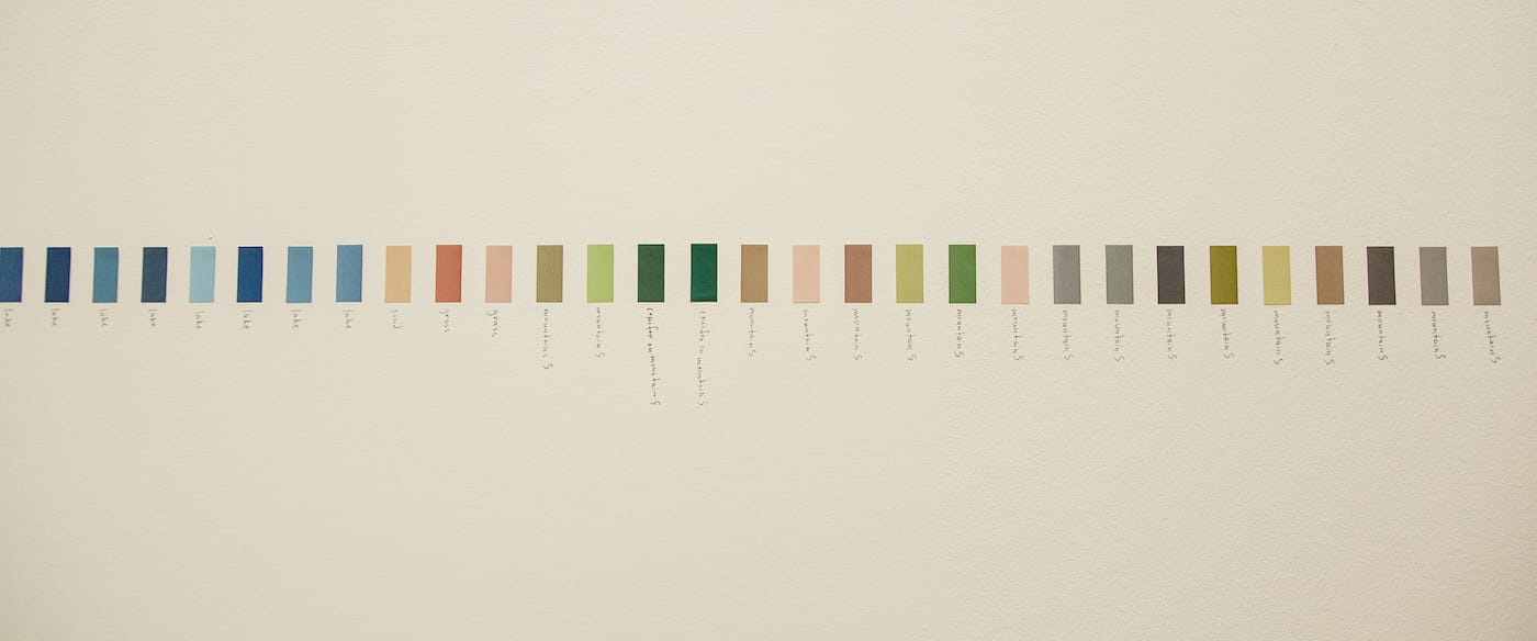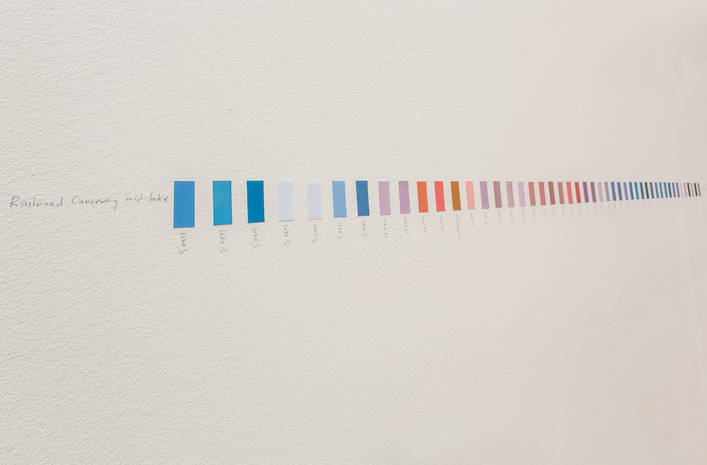 Finch also hand-labeled each chip in pencil to mark its original source; the results dissect the landscape into its subtleties. A soft, celestial periwinkle represents “lake,” but so do many shades of blue, and even bright pinks. The range of hues labelled “mountain” range from browns to grays; from an olive green to a peach. Museum staff had surmised that Finch would return from his journey with many shades of brown, but the resulting vibrant range of color, as Tassie said, “can be shocking,” and may alter common perceptions that the lake and desert are dead.