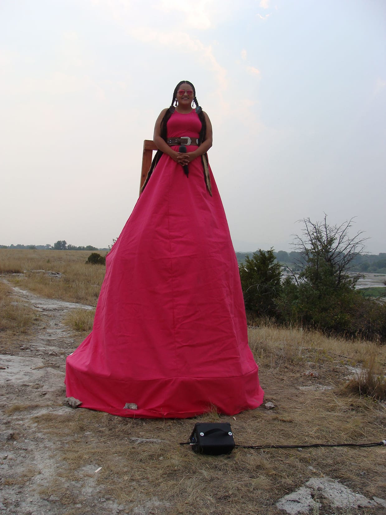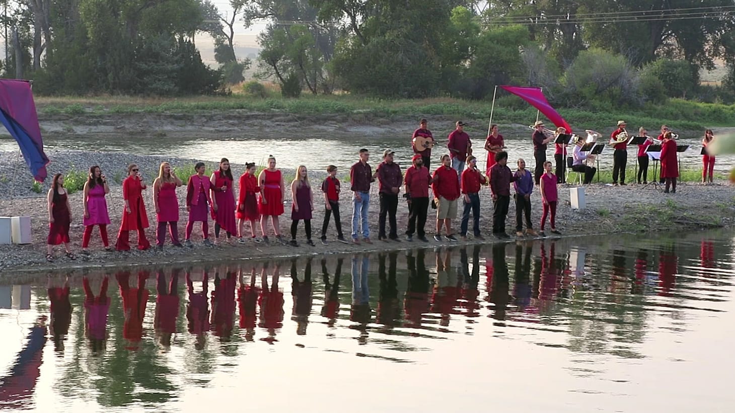 The performance begins at the Headwaters as viewers are led high up the hill to the area called Fort Rock overlooking the Jefferson and the Madison as they merge. There, they are met by the singer Shakira Glenn, a member of the Apsáalooke Crow, who stands above the audience in a twelve-foot tall installation. Designed by artist Jim Madden, Strom, and textile designer Alayna Rasile, the singer looks like she is wearing an enormous fuchsia-colored dress in the color of the choke cherries that grow in the region. Doyle explains that the Headwaters was commonly known in sign language as the “Choke Cherry, Cherry, or Berry River” among the many different tribes who went there to meet and conduct trade. The signification of the choke cherry color is therefore monumentalized by the figure of Glenn, who visually captivates the viewers at the same time that the sound of violins begins to waft from the small speakers placed along the ridge of Fort Rock. Looking down on the rivers below, the audience can barely see the four drift boats that carry the Fox Family Fiddlers who play in the Métis tradition (a Native-Celtic-French culture). As they move up the Madison, their music is being projected from the boats at a far distance. Four other boats arrive upstream on the Jefferson carrying the Brass Band (with trumpeter and tuba player from the School of Music at Montana State University) along with four boats carrying the Choir of orchestral singers to the bank where the rivers converge. Now fully in view, Jamie Fox stands up in the anchored boat against the surging wind and plays the song “Sitting Bull” — Glenn echoes the violin’s phrases, resulting in a hauntingly beautiful melody that emerges powerfully from both the instrument on the water and the voice high up on the hill. This experience in Native singing and Métis violin was incredibly moving, and could only have been effected by nature, the scene of water and mountains — so much so, that when Glenn finishes the set by singing “It’s Been Days,” a Native Round Dance cover about longing, audience members did not know whether to clap or end the moment in silent reverence.
