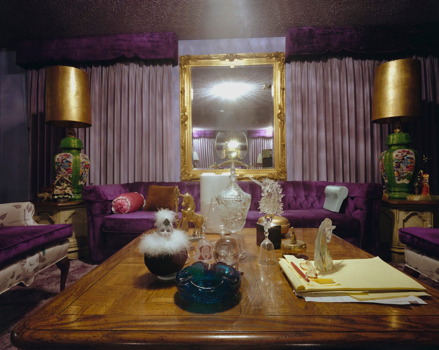 Known primarily as a commercial photographer specializing in architecture, Hursley has an ongoing series of personal photographic projects that he pursues between commercial gigs. This exhibition presents a mixture of images from several of those series, including Brothels of Nevada, Funeral Homes South USA, and Polygamy/FLDS. Though disparate in location and subject matter, they all share a common thread: Hursley has taken a deep dive into off-the-grid American subcultures. These are worlds that we have seen glimpses of in the films of David Lynch, Larry Clark’s iconic book Tulsa, and the photographs of William Eggleston. But a critical difference strikes you as you stand in a room of Hursely’s photographs: There are virtually no people in his work. While the aforementioned artists — and so many others who have sought to capture bits of eccentric America — work with images of people, Hursley writes visual narratives that are devoid of them.