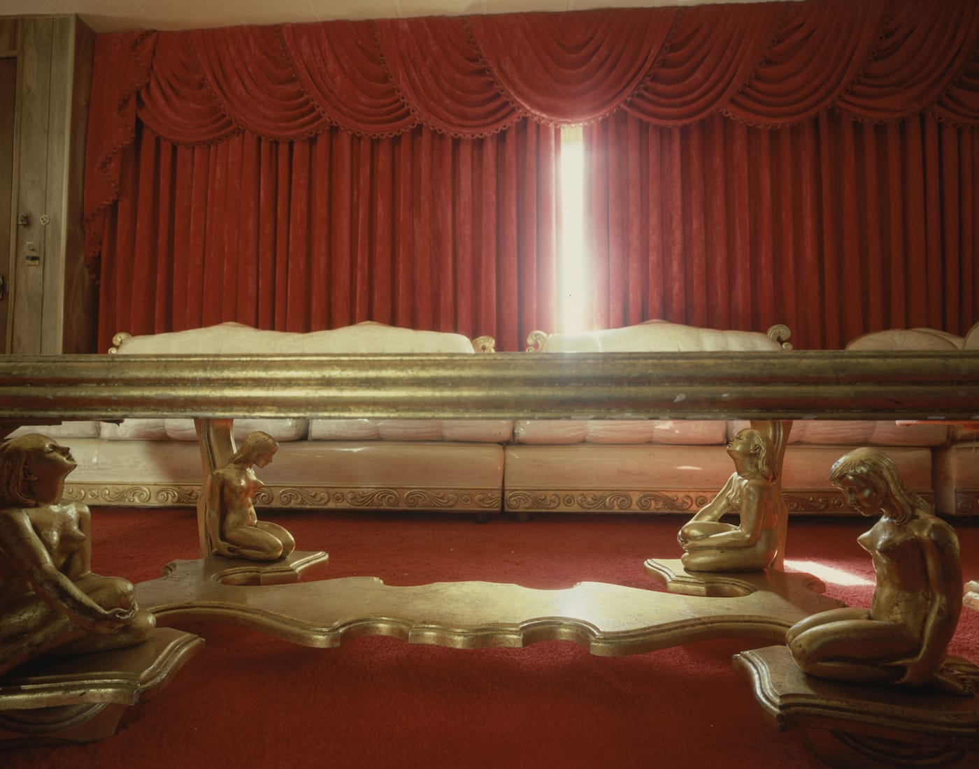 And what stories he tells! Some of the most moving work in the show is of empty brothel rooms, architecture designed for artificial gaiety, sex, and commerce. They are laden with heavy, hot color, garish furnishings, and utter loneliness. There are four related photos from brothels in Nevada hung next to each other that tell a short story in pictures. They all share the same decorating scheme: cheap gold furniture that, to some, might convey a dream of luxury, and light filtered through heavy red curtains drawn lazily against the desert sun. In “Girls Parlor” (1986/1990), we see the off-kilter bodies of two women on a couch — just their bodies, from neck to floor. They sit, carefully placed apart on a white couch, a space wide enough for a man to sit between them, their sagging breasts and passive flesh clothed in negligees. We peer through the base of a coffee table in “Chicken Ranch Parlor” (1986/1990). The ornate decorative golden nude women holding up the marble tabletop don’t look sexy; they look like slaves.