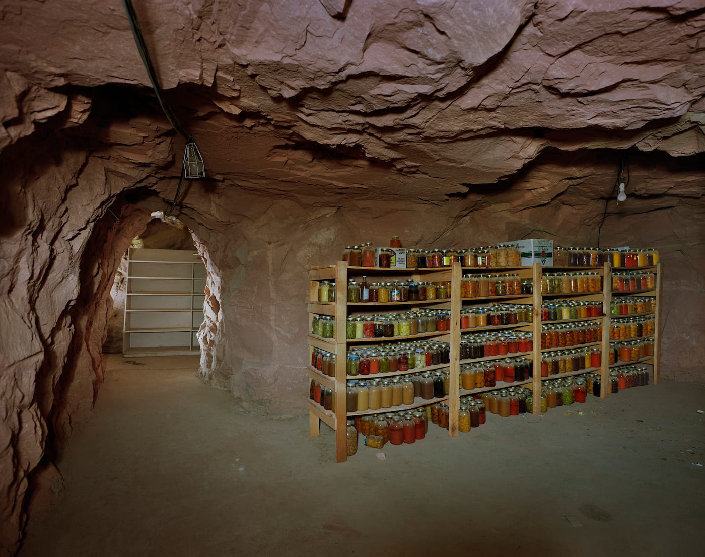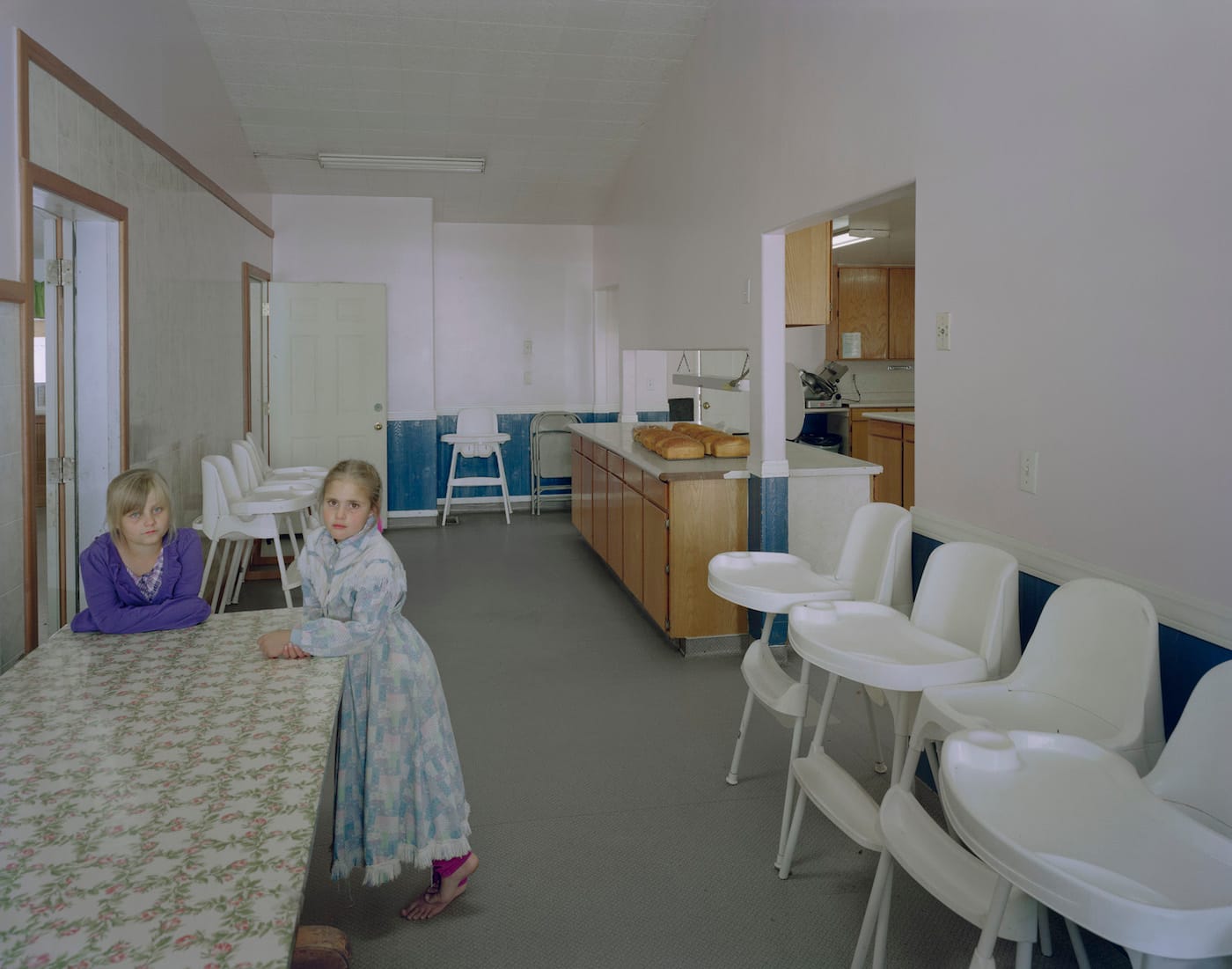 About half the prints in the show are “dye transfer,” a photographic printing technique recognized by its deep, saturated colors. The color in these photographs is sumptuous: reds, aquas, and blues pop with hyperreal richness. Color underscores strangeness in Hursley’s interiors. Even the cooler-toned photos — shots of decidedly unsexy Mormon fundamentalist life and of funeral homes — are suffused with luscious tones. The beauty of the prints belies the deep loneliness of the worlds they portray, but Hursley documents these subcultures without judgment or comment. Despite their literal absence from each image, the occupants of these worlds are evoked with great eloquence by the spaces they have left behind.