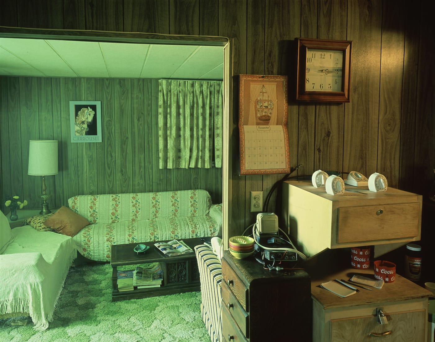 The gallery carefully played with color when installing this show. Immediately next to the “red” photos are two that are suffused in purple and green. “Desert Doll House” (1987/1990) is composed like a photo from an interior design magazine, looking through the doorway of one room into the eerie light of another. The far room glows with a most unnatural shade of green. Banal wood paneling and cheap white furniture appear in a haze. The outer room is in stale suburban décor, save for the fleet of kitchen timers lined up on a cabinet, waiting to be put to use by the ladies.