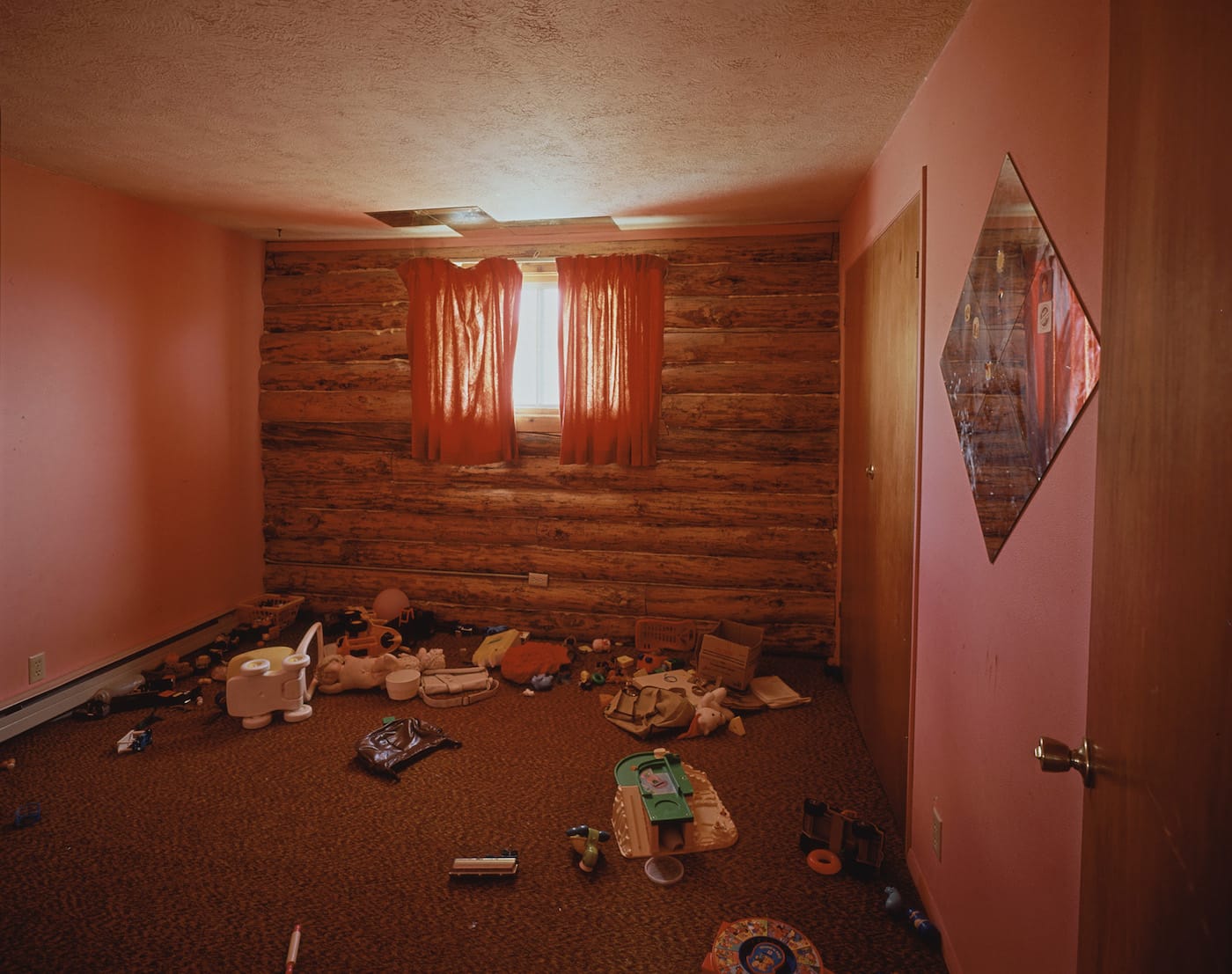 The image that completes the story is “Kid’s Room, Carlin Social Club” (1988/1990). Here we see three sides of a room, two painted a sickly pink and the third with the veneer of a log cabin. There is no furniture, just ubiquitous red carpeting strewn with discarded and broken toys. We don’t know if this is a place to park your children while being serviced or a “playroom” for the children of employees. Either way, the message is grim.