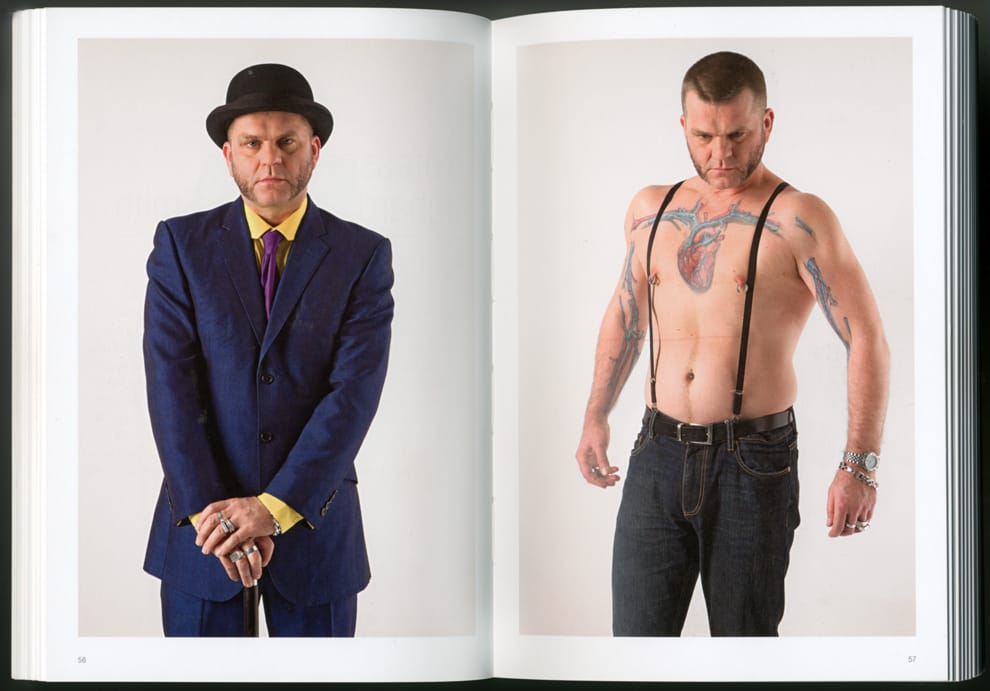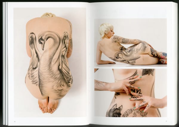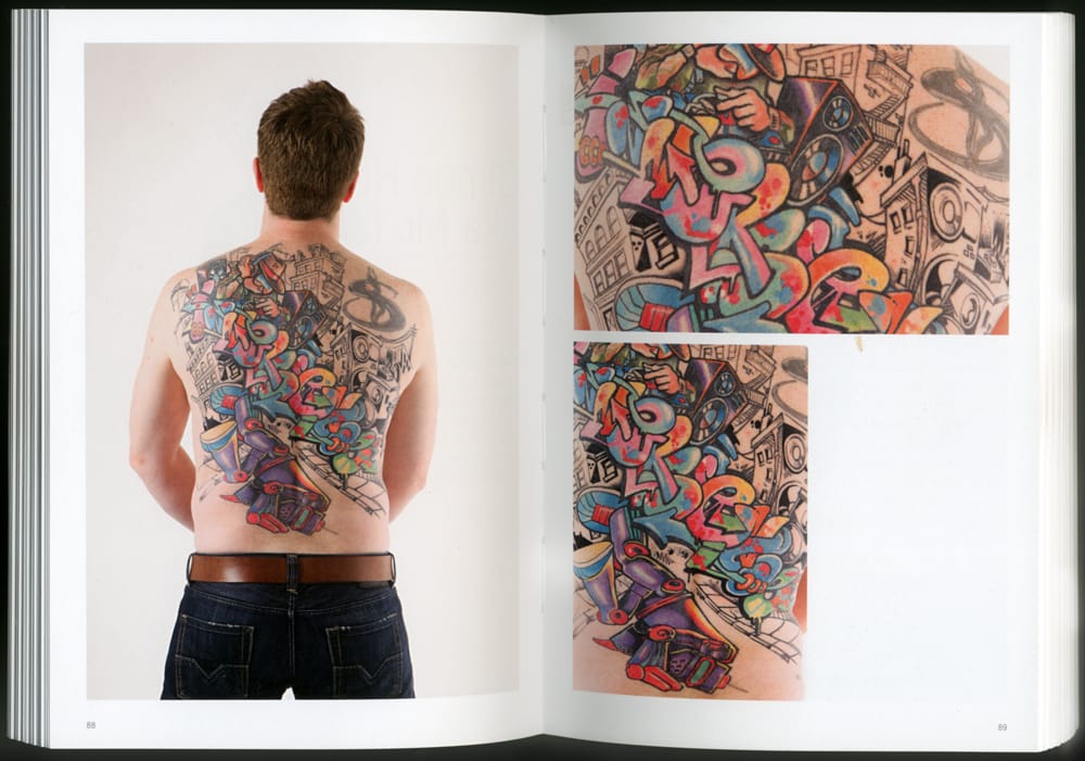 Photographer and photojournalist Alex MacNaughton’s latest book titled London Tattoos (Prestel 2011), is a lighthearted book of portraits featuring Londoners and their tattoos. Shooting his portraits in the studio against a neutral white background, reminiscent of white gallery walls, MacNaughton treats tattoos, and the bodies they are etched upon, like works of art. Showing only one image of each person fully covered in street clothes, MacNaughton crops and edits his photographs to show different parts and pieces of the body.