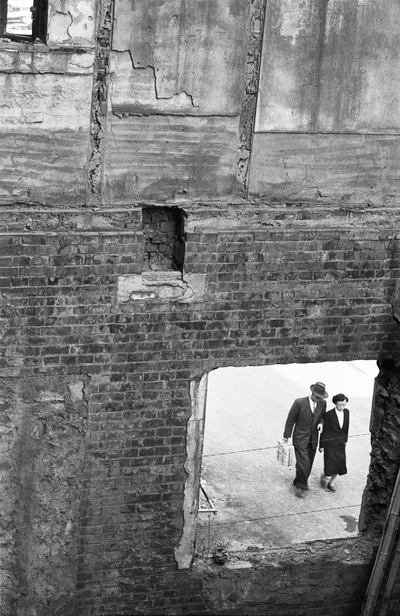 Despite all that is inferred or revealed in these photographs, there’s a past that cannot be accessed simply by looking at the city itself. More profound, though inaccessible, meaning lies behind the faces caught looking at the camera, as they pause for a moment to observe the photographer himself. As viewers we see surprise, suspicion, and curiosity in their glances. Youngsoo wrote about this period in his book Korean Lives After the War, 1956–1960, saying: