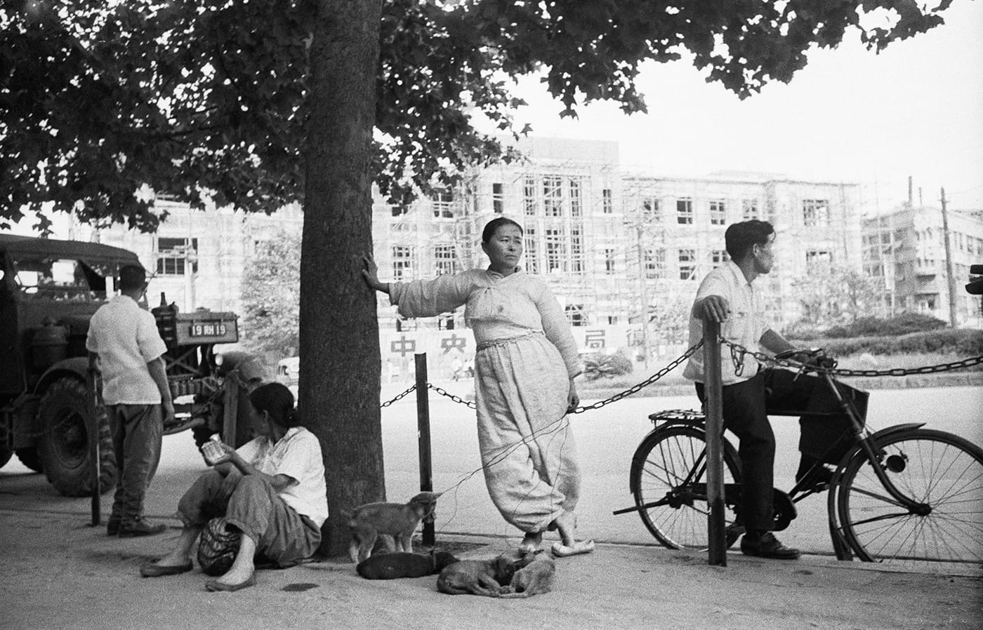 Youngsoo appears careful to show many sides of Korean society. There’s a distinct tension in the images between public and private spaces, and figures hidden in shadows behind cracked doorways hint at lives we never quite see. Women in elegant dresses and decadent furs are shown lingering near boutiques, movie theaters, and Hollywood-esque billboards downtown, all evidence of their changing status. By contrast, a sense of labor and toil permeates many of the images of the unemployed and working class, taken on the outskirts of the city. Children play games in the dusty streets, and women wash laundry in the river. Digging deeper into the emerging hierarchy of Korean society, Youngsoo also documents those who are without activity, standing still in a sea of urban noise as reminders of the people left adrift in times of upheaval. In one particularly captivating image, a woman accompanied by four puppies stares vacantly into the distance, waiting for possible buyers.