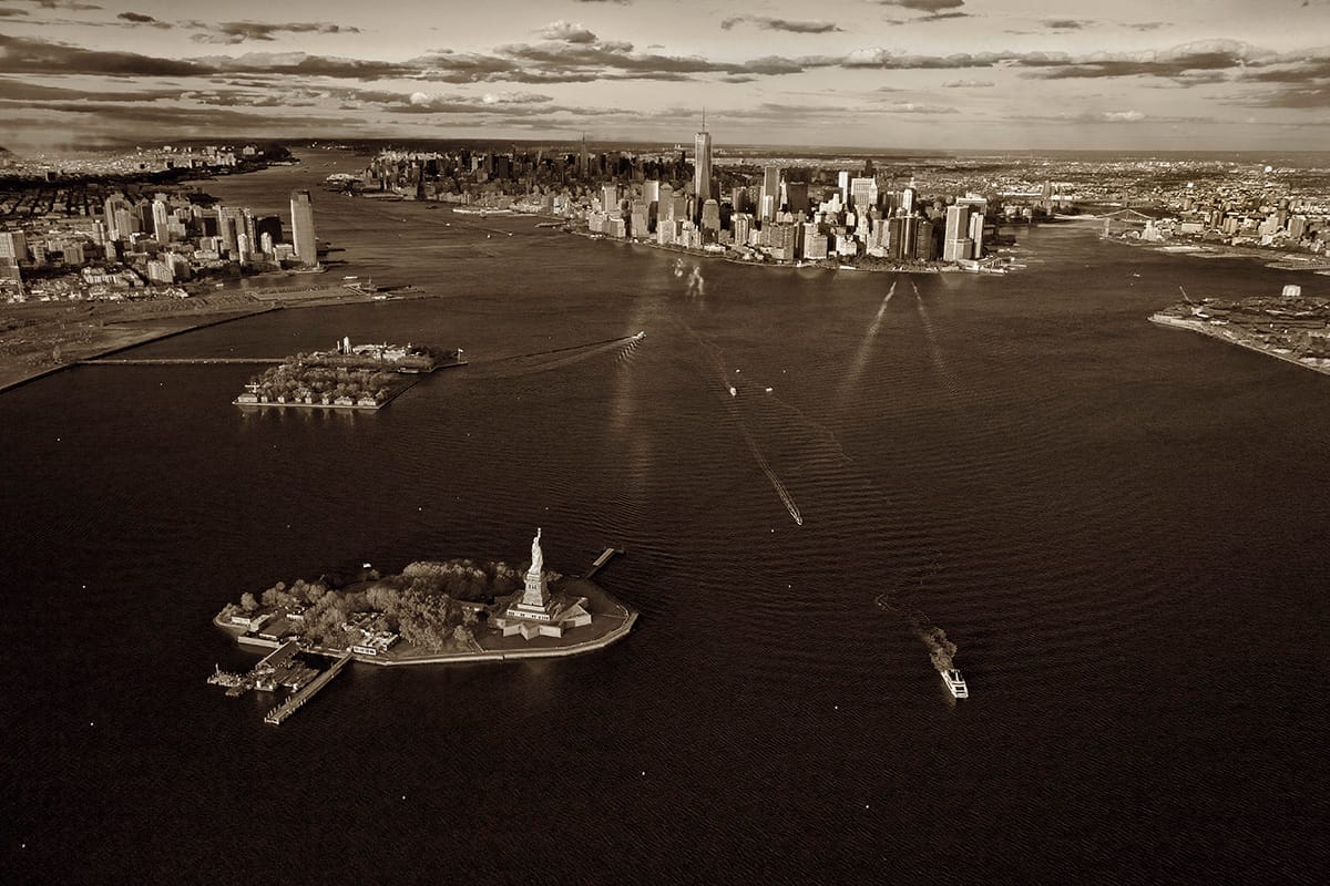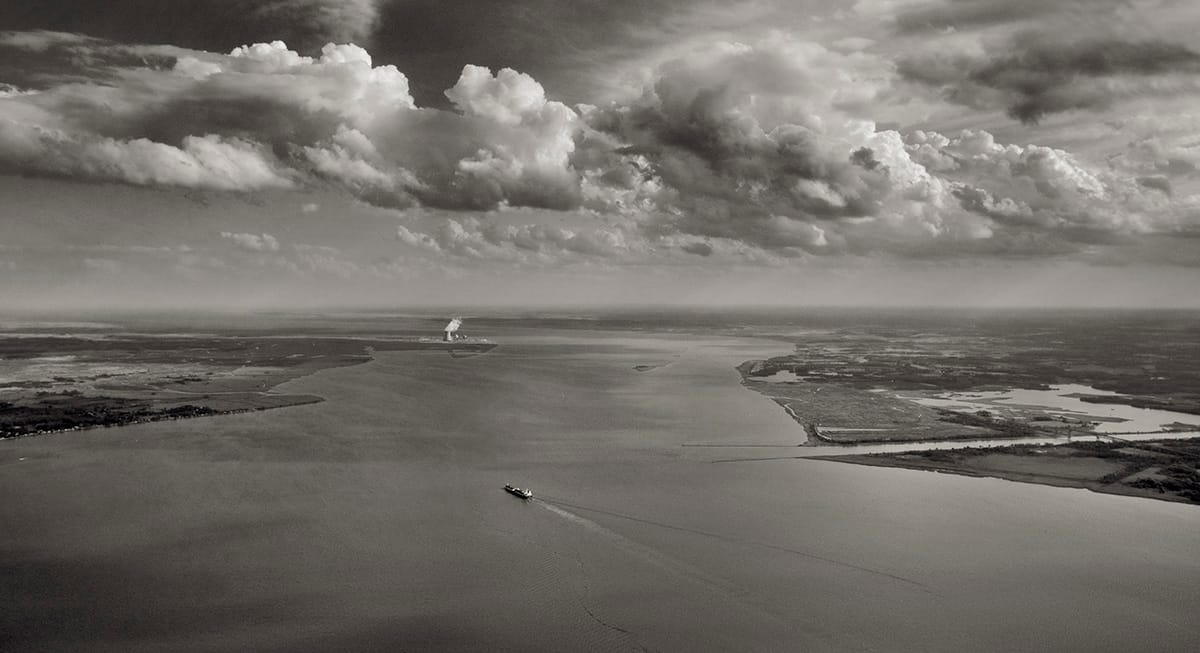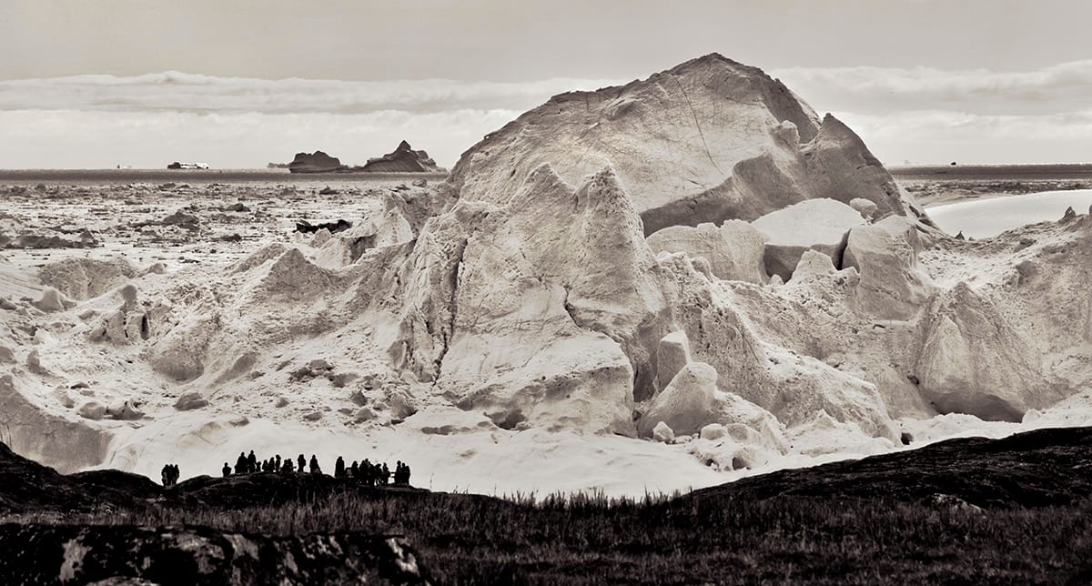 Starting in Greenland at the Arctic Circle and continuing south to the Dry Tortugas in the western Florida Keys, Freese created a photographic voyage down the east coast, seen both from above and at eye level. On one page of the large hardback, the perspective is on the ground at the mouth of the Jacobshavn Ice Fjord, with an incredible panorama taking in its icy peaks and the human spectators dwarfed by its form; on another, the New York Harbor is witnessed from the sky, an angle that emphasizes the proximity of the Statue of Liberty and Manhattan’s high rises to the water. Shots of a polar bear on the ice floes near Baffin Island and the eroded forms of the Hopewell Rocks in the Bay of Fundy showcase the east coast’s natural beauty. Developments like the homes perched on the rocky coast of Uummannaq, Greenland, and the Turkey Point Nuclear Generating Station on the edge of Florida’s Biscayne Bay underline its delicate connection to the waterways.