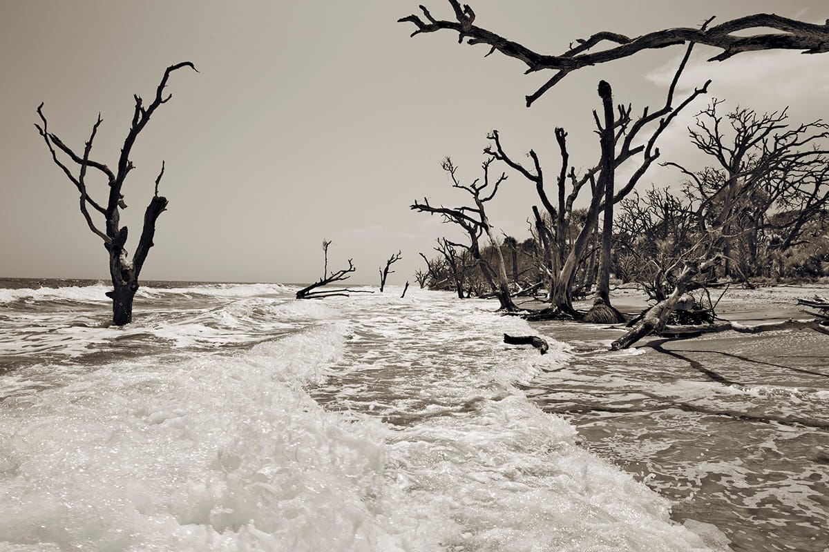 Freese’s sepia-toned images recall 19th-century landscape photography, and the use of the medium as a form of activism goes back to that era. On view in the National Gallery of Art’s exhibition East of the Mississippi: Nineteenth-Century American Landscape Photography is an 1888 photograph by Seneca Ray Stoddard capturing a field of dead trees, drowned by an industrial dam. One of Freese’s most haunting landscapes echoes Stoddard’s vision, focusing on the silhouetted skeletons of trees caught in the rising currents on South Carolina’s Edisto Island. While the American government continues to lag in addressing climate change, photography can, hopefully, be a catalyst for action.