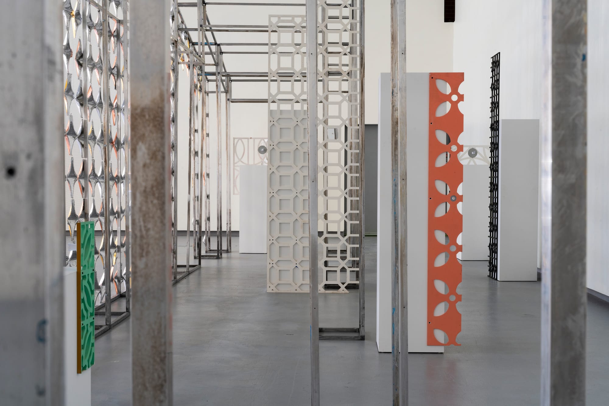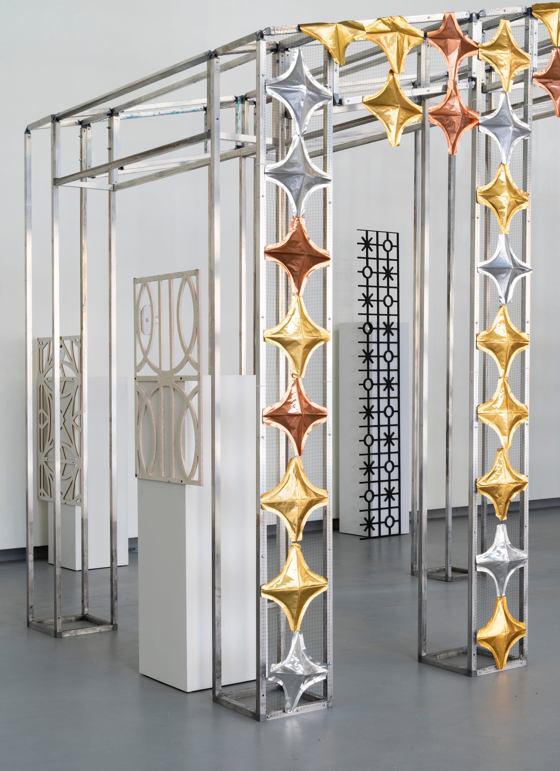 Destination/El Destino: A Decade of GRAFT, currently on view at the Hyde Park Art Center, offers an overview of the seemingly limitless iterations that the project has taken since its beginnings. These include the curlicued, rust-color two-wall wraparound that opened the Whitney Museum’s no existe un mundo poshuracán; kaleidoscopic wooden screens for a front porch at Project Row Houses; pink, mint, and white freestanding dividers with shelves, used to display salvaged liquor bottles at the Albright-Knox Northland; and graphic window and door grilles for a dozen art venues around the country, including El Museo del Barrio and Rice University’s School of Architecture. “Casa-Isla,” a house-shaped pavilion in shades of blue, floated, like a mirage, in the lagoon of the Chicago Botanic Gardens last summer. “Screenhouse,” a surprisingly airy gazebo of black concrete blocks, currently provides much-needed shade and privacy in tourist-thronged Millennium Park.