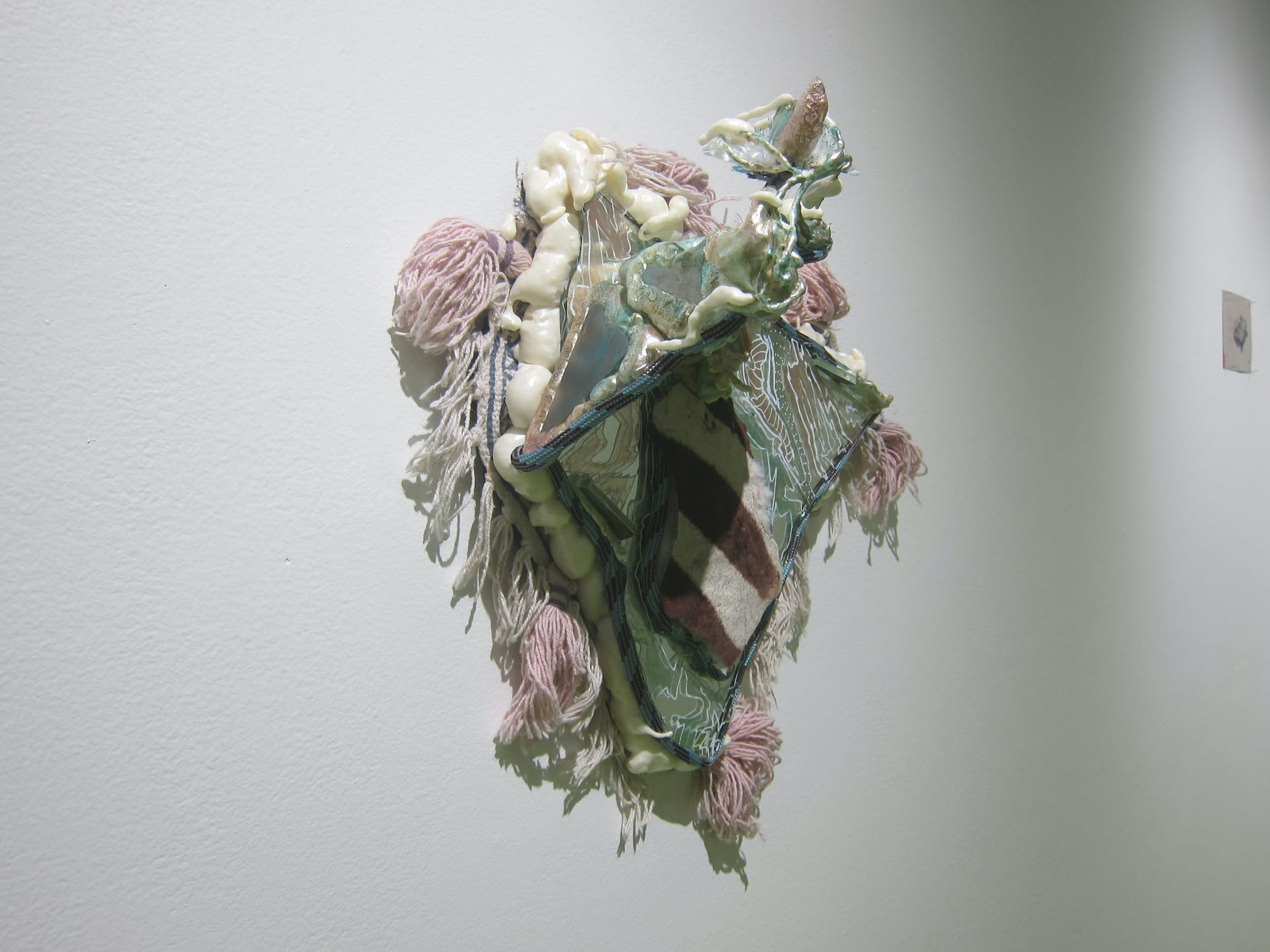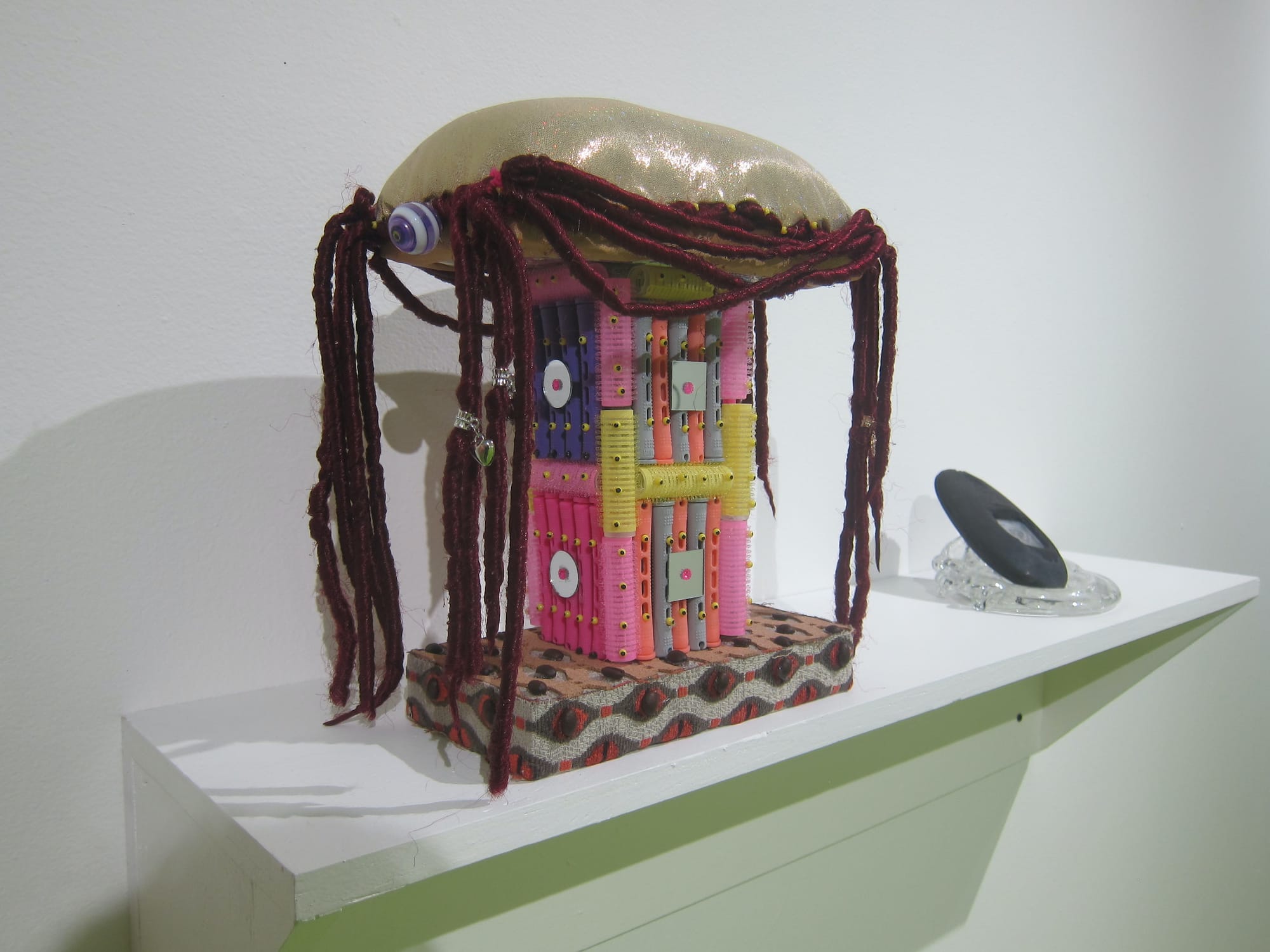 Strange and magical art in manageable sizes abounds in Amuleto. There are those that harness raw power: Dianna Frid’s yellow rain hood, lined with silver foil, promises cosmically enhanced sensitivity; Whitney Bradshaw’s photograph of herself as a Sheela-na-Gig, her crotch a blinding flash of light, protects against patriarchal control of women’s bodies; Jonas Mikosch Mueller-Ahlheim’s blocky sculpture plugs directly into an electrical socket. Others manipulate loaded materials to advantageous ends: John Preus spray-foams together a funky arrangement of mirror, rope, and a zebra pelt shot by his father, there being all kinds of inheritances; kg’s tiny red-and-white weaving incorporates golden charms and scraps, presumably for good luck; Cydney Lewis fashions a tall headrest from curlers and fake dreads for better dreams (and hair). Some results are inscrutable but magnetizing, like Juan Chavez’s giant pendant of orange handmade paper in a shape that seems vaguely Meso-American, Jim Duignan’s five cast bronze whistles, and Maria Burundarena’s emergency blanket wall hanging, agleam with disco lights. Plenty encourage meditation: Michelle Chun’s beaded necklaces, drawn in colorful pastel, loop and tangle endlessly, while Kushala Vora’s vertical arrangement of stones, feathers, miniature enamel eyes, fruit peels, and dead leaves offers narrative, spiritual and aesthetic abundance well beyond its means.