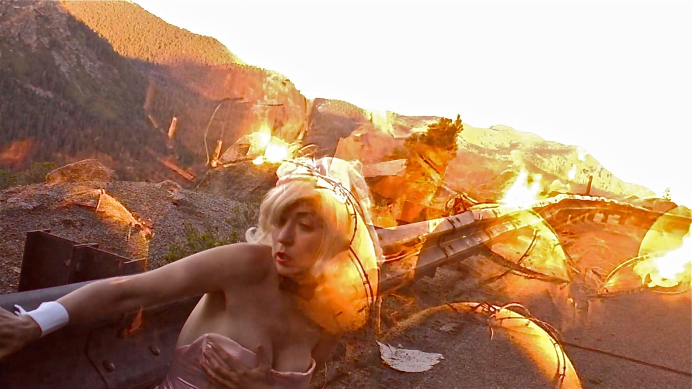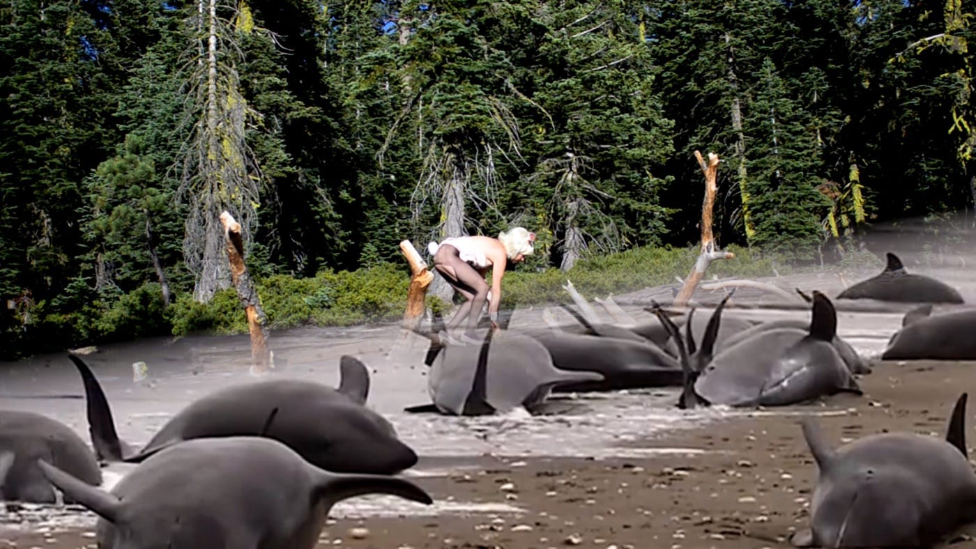 As Monet Clark‘s performance video “Bunny Girl” (2016) begins, a coquettish Playboy Bunny flirts toward the lens in a blond wig while she stumbles in failing heels down a remote, forested highway. Immediately, we recognize the cartoonish contours of sexualized satire. As the character shakes her platinum curls and adjusts the high-cut costume, she is oblivious to a sublime stand of tall pines framing her figure in the shot. Throughout the piece she will tragicomically sojourn through sequences of fields, trees, and streams. Her pink satin bodice will stain and her stockings will rip. Eventually, we see her pulling herself in her Playboy bustier across a log as we hear urgent news footage announcing environmental catastrophe. Footage of sick and dying seals overlays her image and juxtaposes with her body. The campy figure slips into being an actual, vulnerable, suffering animal.
