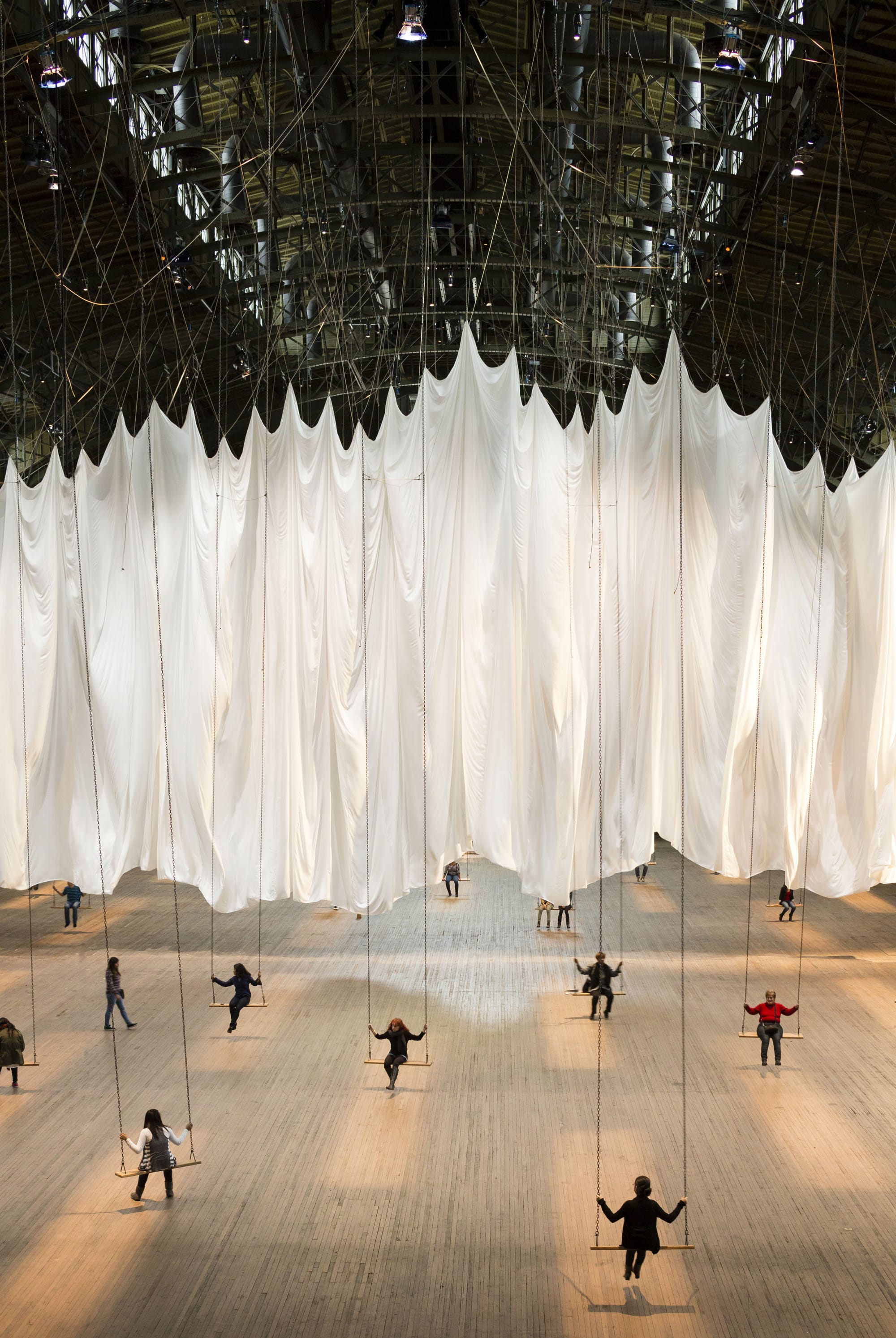 At its core, the installation features two fields of suspended swings connected via ropes and pulleys to each other and to a massive white curtain that bisects the 55,000-square-foot Wade Thompson Drill Hall. Each swing has its counterpart on the other side and it is the visitor’s momentum on the swing that activates a rolling undulation of the curtain. The resultant movement brought on by one swing is enhanced when another visitor engages the corresponding swing on the opposite side. The movement of the curtain alone is mesmerizing and the beauty is that the curtain remains in a continual state of flux set in motion by the interaction of visitors.