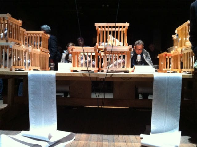During opening night, a young boy came running through the space yelling, “Look Mom! It’s my sack lunch.” Not just any sack lunch, though: This one spouts historic texts by philosophers (Aristotle, Johann Gottfried Herder, Giambattista Vico), naturalists (Charles Darwin and Ralph Waldo Emerson), an explorer (Captain William Dampier), as well as contemporary authors Susan Stewart and Lewis Hyde. Continuing the theme of transmission, there are 42 homing pigeons housed in cages surrounding the readers’ table.