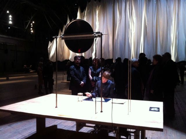Brooklyn artist Audra Wolowiec, who has her own austere practice, has been assisting in Hamilton’s projects since 2009 when she was an attendant in Hamilton’s “human carriage” installation in the rotunda at the Solomon R. Guggenheim Museum. For “the event of a thread,” Wolowiec was invited as the writer at the second desk. Wolowiec had this to say about being inside one of Ann Hamilton’s installations: