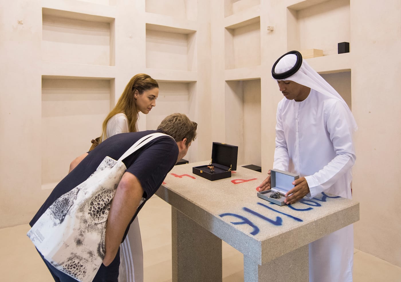 That craft can be something deeply transformative is exemplified in an exuberant manner by Abdelkader Benchamma’s cave-like site-specific drawing “Neither the sky nor the earth” (2017), which covers the walls and ceiling of one of the Al Hamriyah spaces. There is an incredible amount of detail and movement in Benchamma’s black ink and felt-tip pen strokes. They envelop and transport the viewer forcefully. And Hana Miletić’s hand-woven textiles, which thoughtfully punctuate the perimeters of the Al Hamriya space, are based on photographs of damage and neglect the artist took of her surroundings, but they translate into tender frayed weaves, beautiful in their intended imperfection. Craft and its economy is also something at stake in Christodoulos Panayiotou’s contribution, “Untitled” (2017), which transforms marble crystals into jewelry, performatively taken out of precious jewelry boxes and shown to viewers.