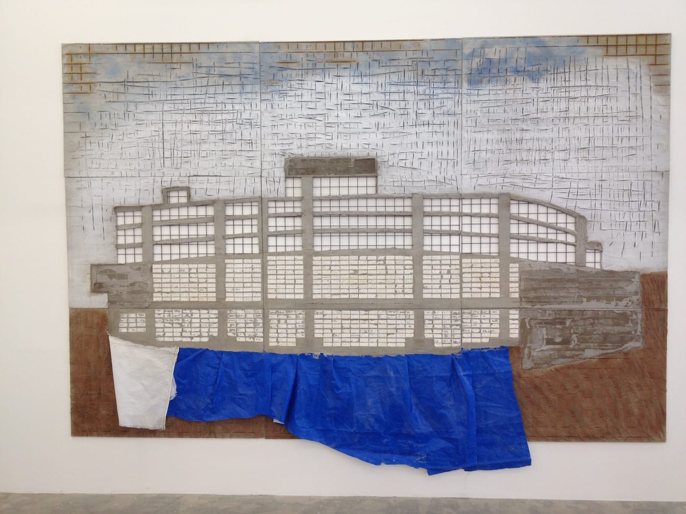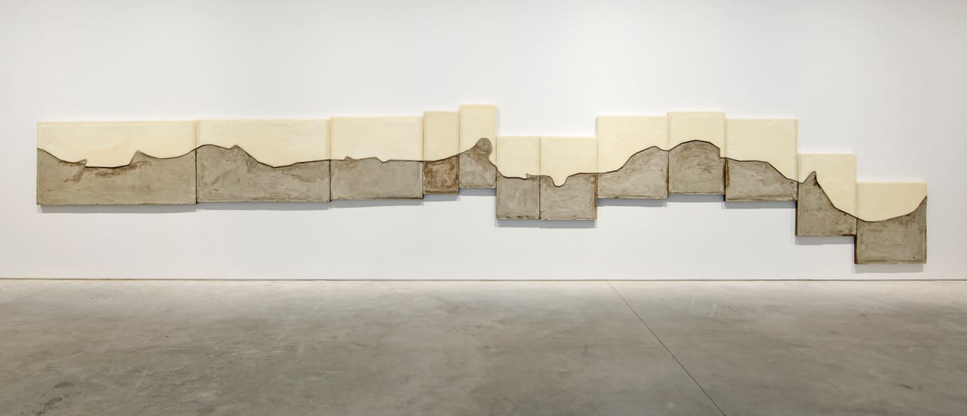 And then there is Rechmaoui, who ups the ante by underlining unbridled human intervention and greed. Using the construction materials of real estate development — concrete, iron grids, and tarp — he depicts in his tableau a construction site that sat across from his studio, one of many such sites in Beirut’s frenzied building craze. As with much of Rechmaoui’s work, the piece has a rough and unfinished yet enticing, ghostly, painterly quality to it. This echoes the stark reality of the questionable legality and the exploitation of cheap labor of Syrian refugees that these building projects often entail in Lebanon. The absence of builders hovers over this eerie work. Rechmaoui continues in this vein for his newly commissioned project in Al Hamriyah, a fishing village north of Ajman and a 45-minute drive from Sharjah city center, where SAF has built new artist studios and exhibition spaces. For “Untitled 12” (2017), he pits high-paced coastal development against its negative effects on marine ecosystems. With the UAE being one of the most highly impacted marine areas in the world, the artist sounds a subtle but urgent word of caution in twelve panels that together create a shoreline in which concrete makes up the land and beeswax the sea. In Rechmaoui’s abstract cartographic composition, nature, urban development, and globalized hyper-capitalism quietly battle each other.